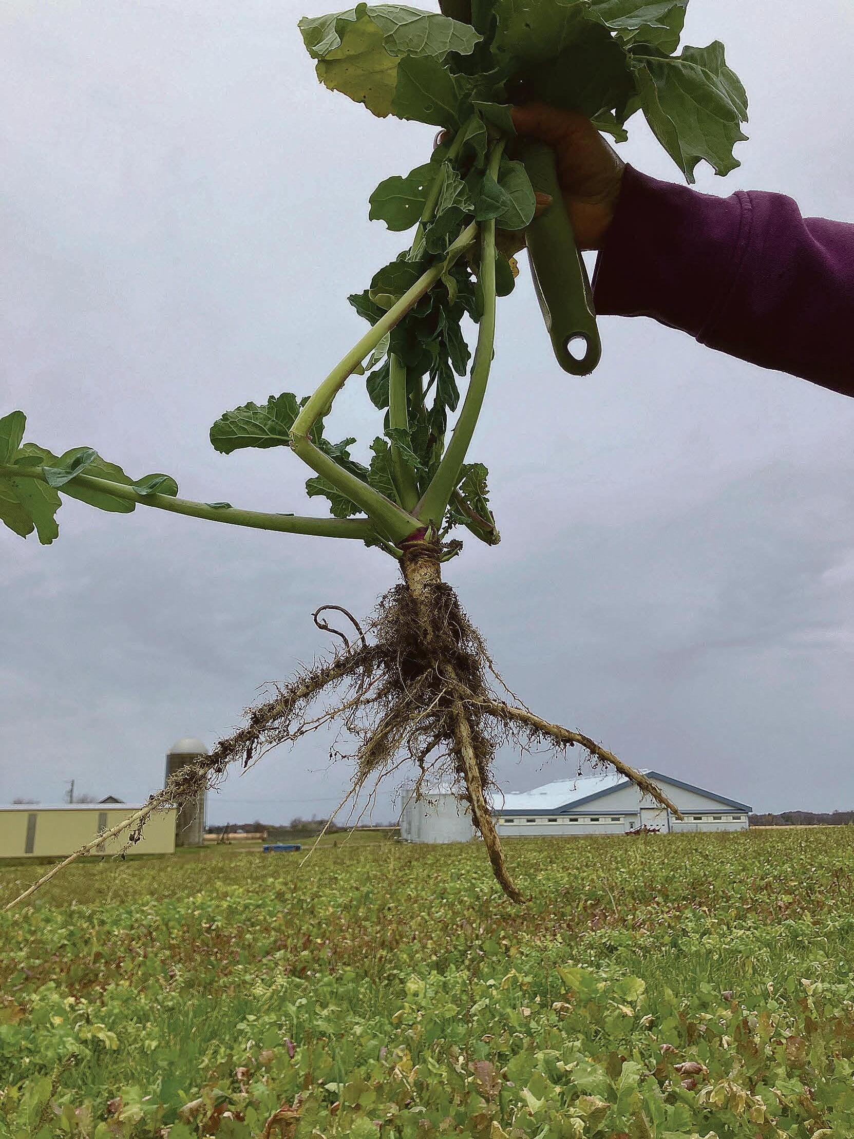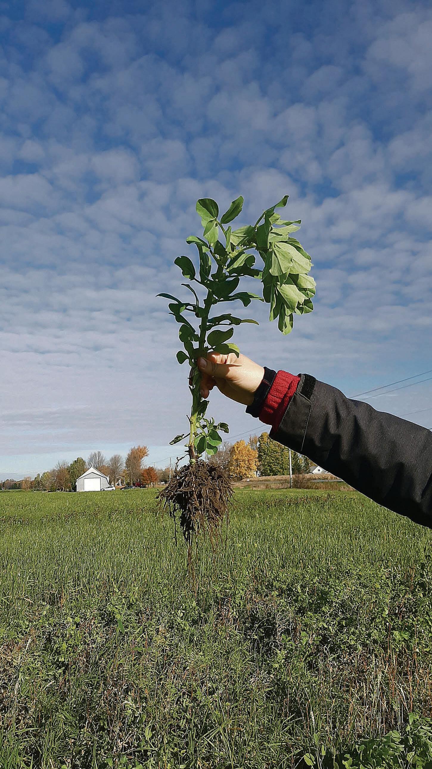 région. Les inclure aux cultures de couverture représente un gain en termes de biodiversité. Le kale est une plante à découvrir pour son système racinaire profond et sa tolérance au froid. Sa racine combine les caractéristiques du radis fourrager et de la moutarde : elle peut se faufiler dans des espaces trop serrés pour la racine du radis, tout en étant plus ramifiée que celle de la moutarde. La semence est d’une grosseur semblable à celle du radis et peut donc facilement être semée en mélange avec d’autres espèces. Cette plante peut s’avérer un excellent allié de la sous-soleuse. Son défaut? Comme elle peut survir à l’hiver, les producteurs doivent prévoir une intervention au printemps pour assurer sa destruction, si nécessaire. Les conseillers agricoles jouent un rôle clé dans le suivi de vos cultures de couverture. En vue de la récolte qui approche, essayez de nouvelles variétés dans vos mélanges. Allez marcher dans vos champs avec une pelle. Qui sait, vous découvrirez peut-être une nouvelle plante chouchou!