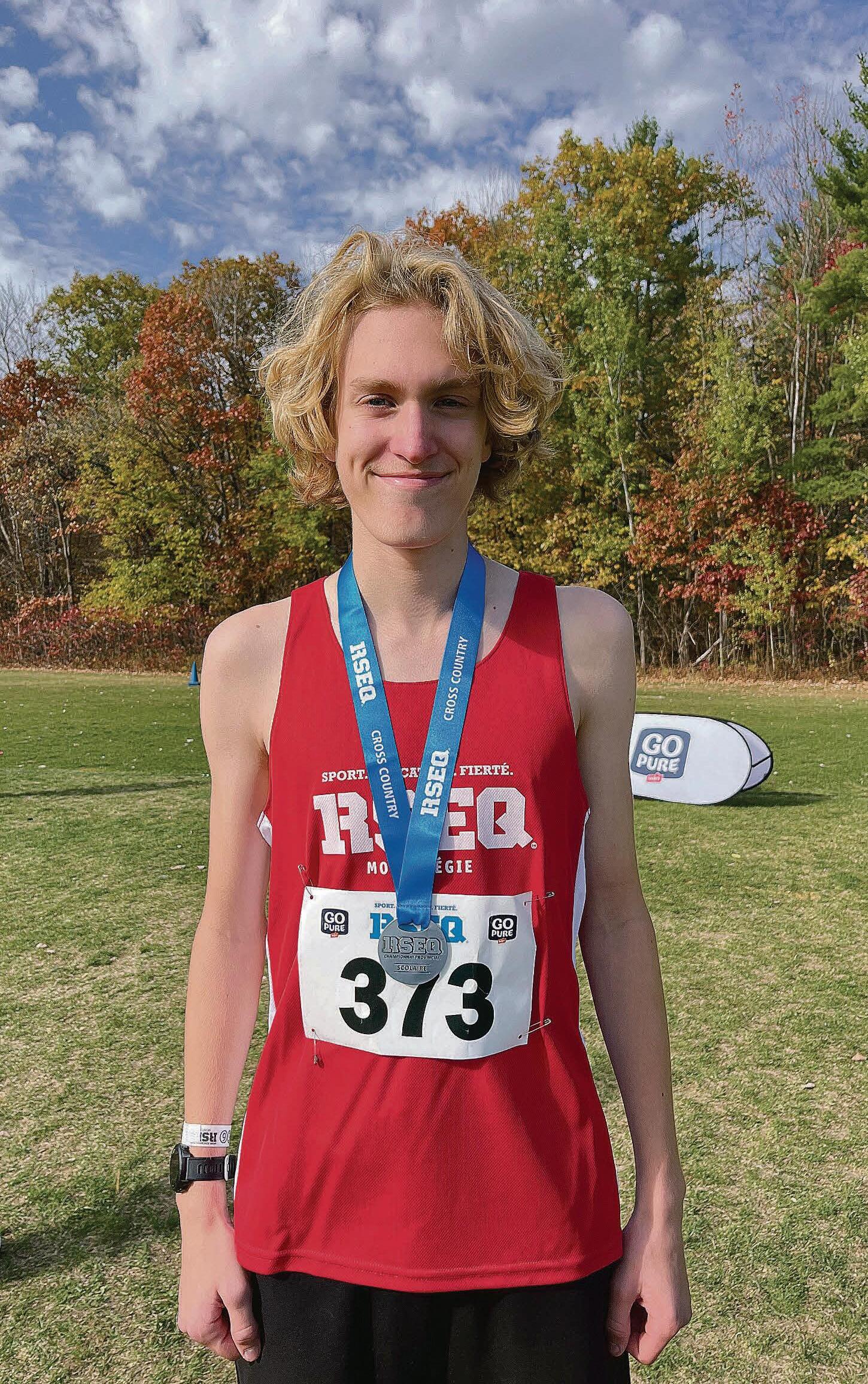 Le coureur de Belœil Owens Gibbs-D’Avignon (photo) s’est distingué au championnat provincial scolaire de cross-country présenté le 18 octobre dernier, à l’école secondaire Louis-Joseph-Papineau, à Papineauville. L’étudiant au Collège Trinité de Saint-Bruno-deMontarville a remporté la médaille d’argent dans la catégorie juvénile masculin. Les performances du jeune homme ont permis à la Montérégie de terminer au 2e rang du classement cumulatif. Il s’agissait d’un 42e podium pour la Montérégie depuis la toute première compétition en 1972. Douze coureurs montérégiens ont terminé dans le top 10 à ce championnat. Photo gracieuseté