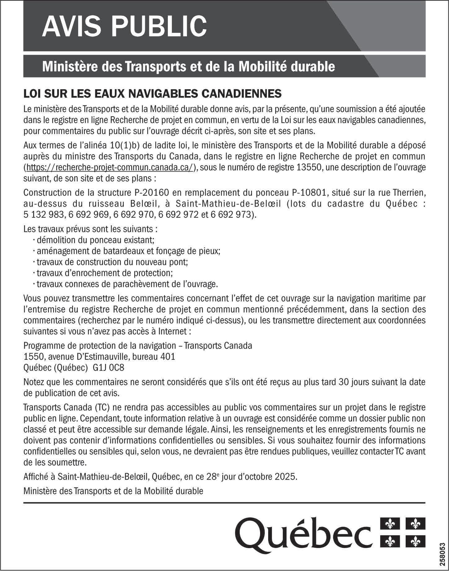 Hilaire, Otterburn Park, Saint-Jean-Baptiste, Saint-Charles-sur-Richelieu, Saint-Denissur-Richelieu et Saint-Marc-sur-Richelieu. La période d’inscription se tiendra du 3 au 28 novembre. Pour faire une demande, téléphonez au 450 467-9373, poste 232, et laissez un message.
