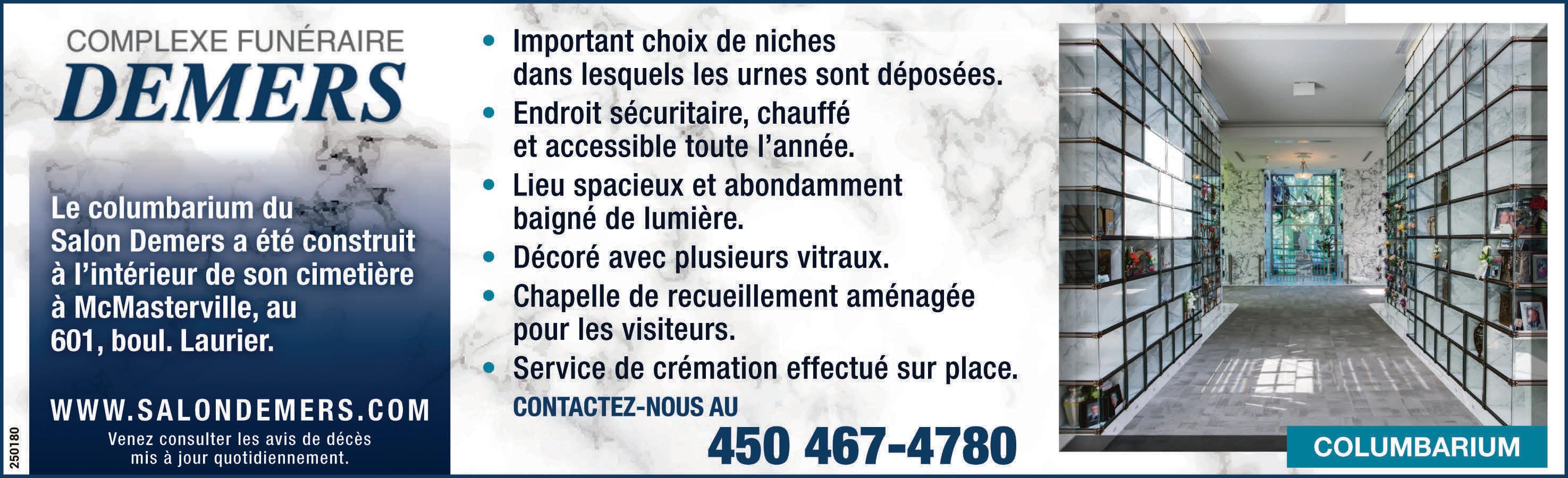 651, boul. Laurier McMasterville www.salondemers.com le samedi 8 novembre dès 10 h, suivies d’une cérémonie en la chapelle du complexe à 11 h. Vos témoignages de sympathie peuvent se traduire par des dons à la Fondation des maladies du cœur et de l’AVC.