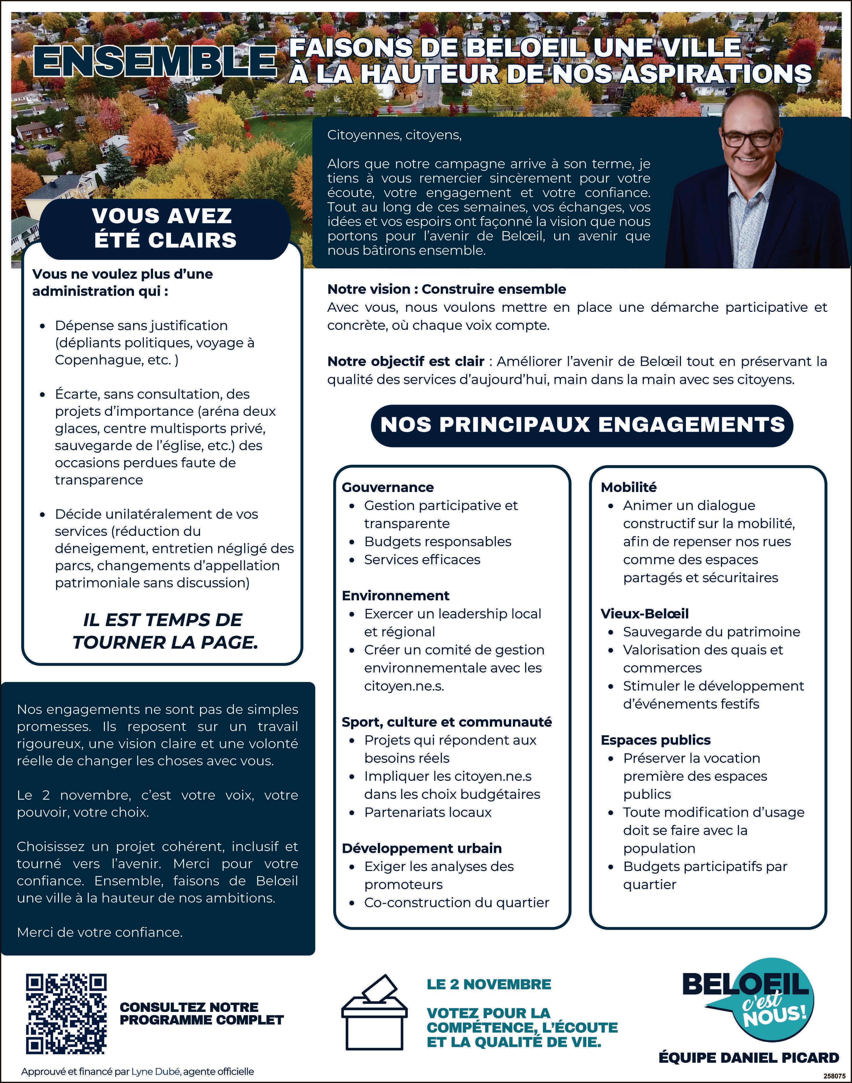 Depuis septembre, Oser Belœil a présenté six engagements majeurs issus de sa plateforme électorale, incluant la promesse d’entamer les travaux de construction d’un nouvel aréna d’ici 2028, de limiter la hausse moyenne du taux de taxes résidentielles à 2,25 %, d’investir 1 M$ pour dynamiser les activités nautiques sur le Richelieu, de déposer une politique de transparence municipale, de créer un pôle du savoir sur le territoire et d’ajouter une cible de 20 % de logements sociaux et abordables dans les nouveaux projets résidentiels.