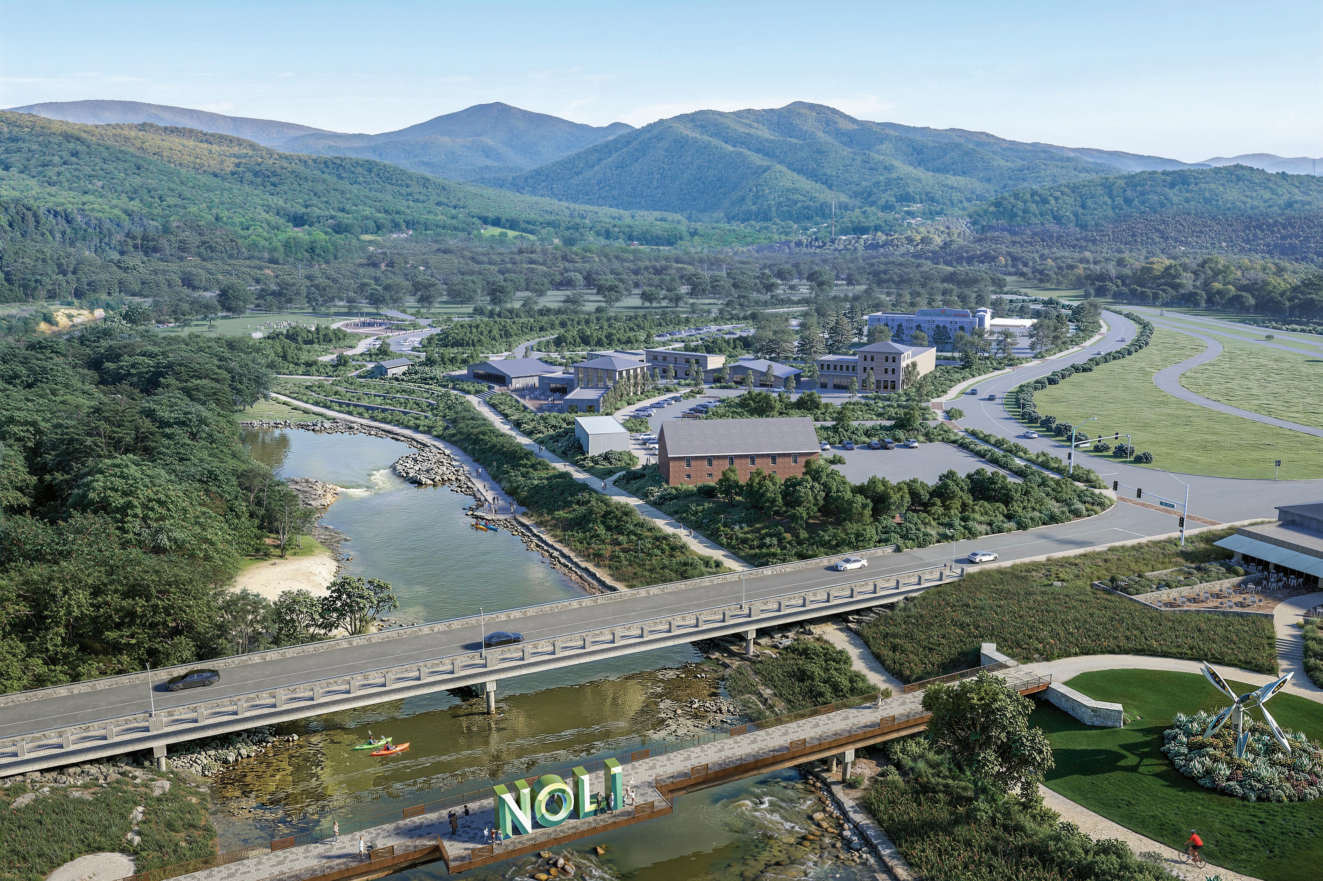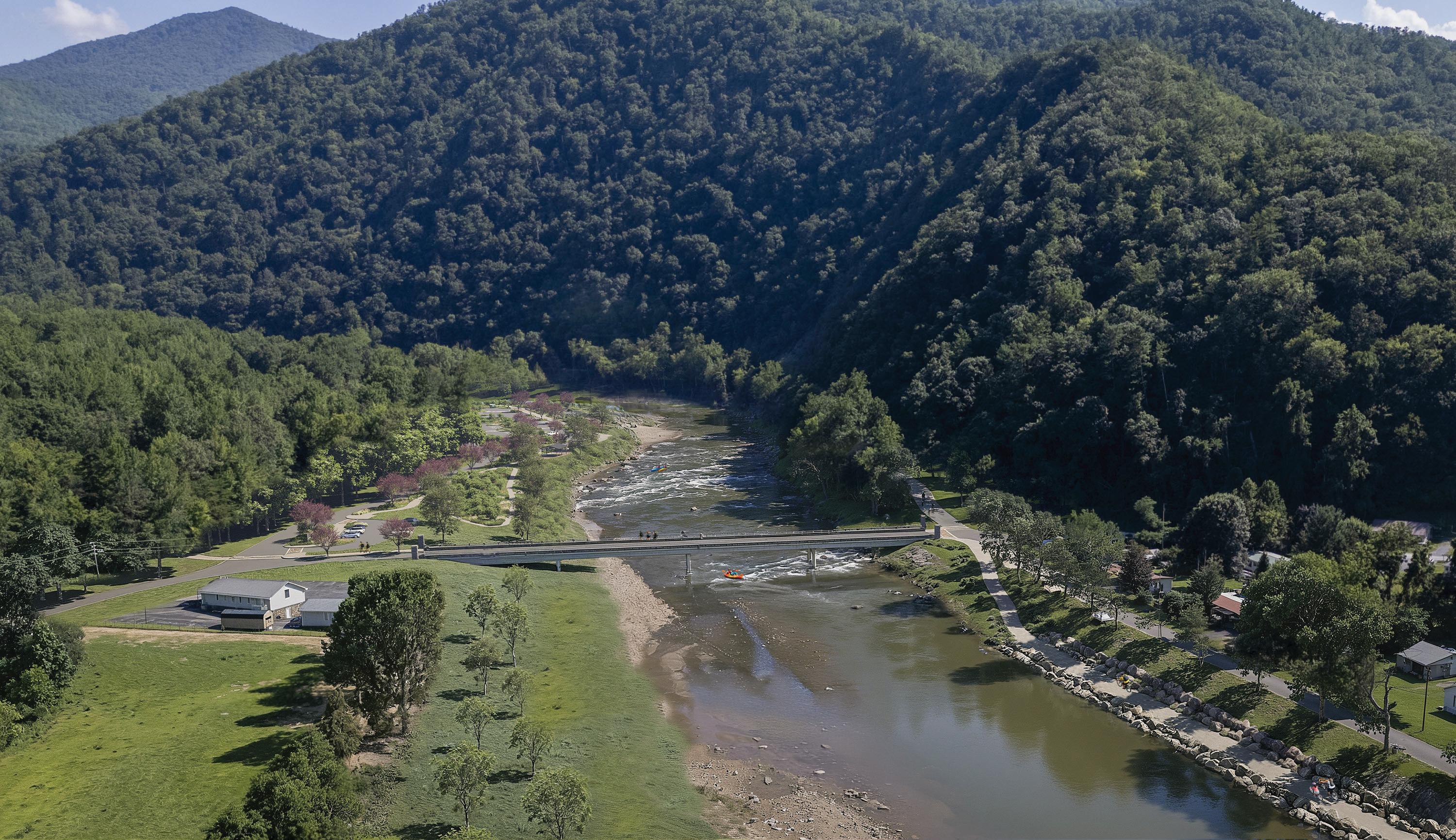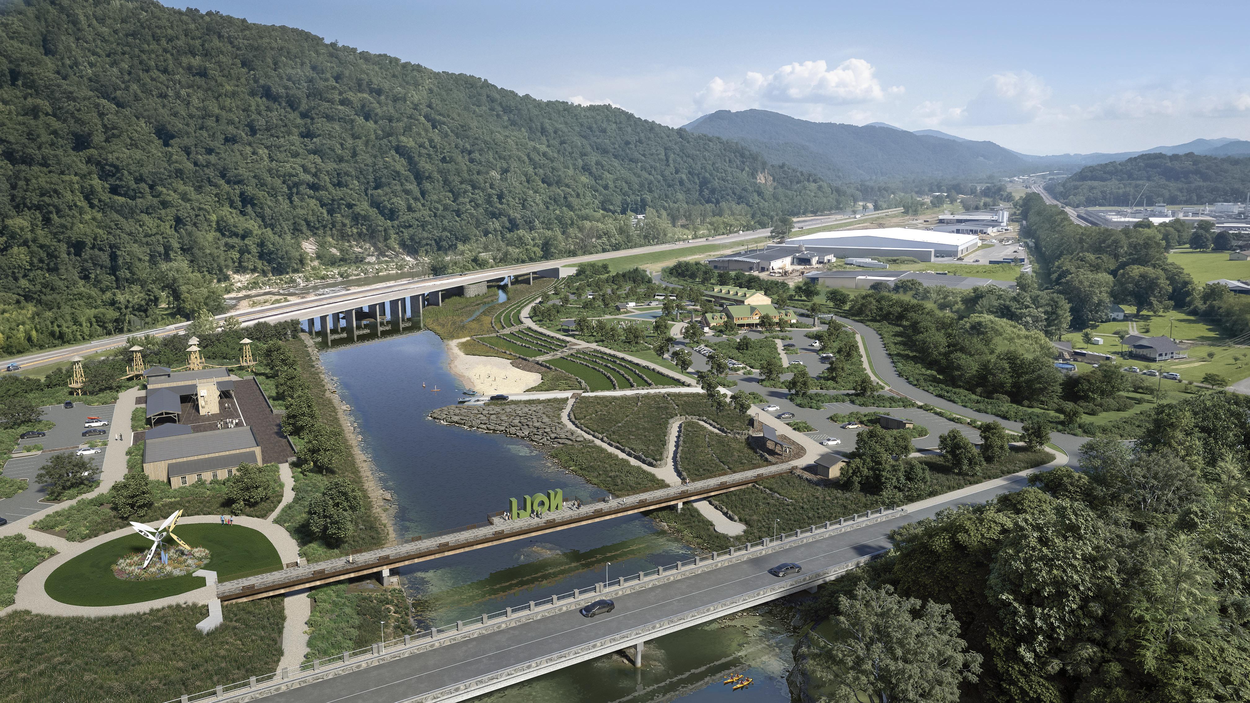 2.2.5 Nolichucky River Park. Collaborate with key stakeholders to implement a riverside park that includes the Nolichucky Riverwalk, river access, fishing access, large group picnic shelters, event stage and open green, restrooms, parking, and streambank restoration.