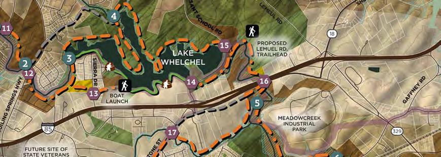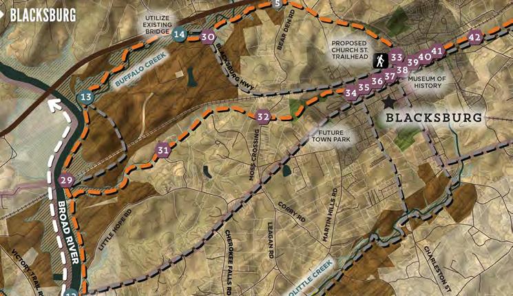 This planning section includes 20 road crossings and two rail road crossings. Crossing #29 is an underpass of the existing rail trestle over the Broad River. The trail crosses Blacksburg Highway twice (#30 and #33). Crossing #30 is proposed as an underpass along Buffalo Creek. The preferred route crosses seven downtown intersections (#34 through #40) on Church Street. The historic-preferred route has eight road crossings and one rail crossing. Crossings #46 and #48 are underpasses at Leagan Rd. and Charleston St.