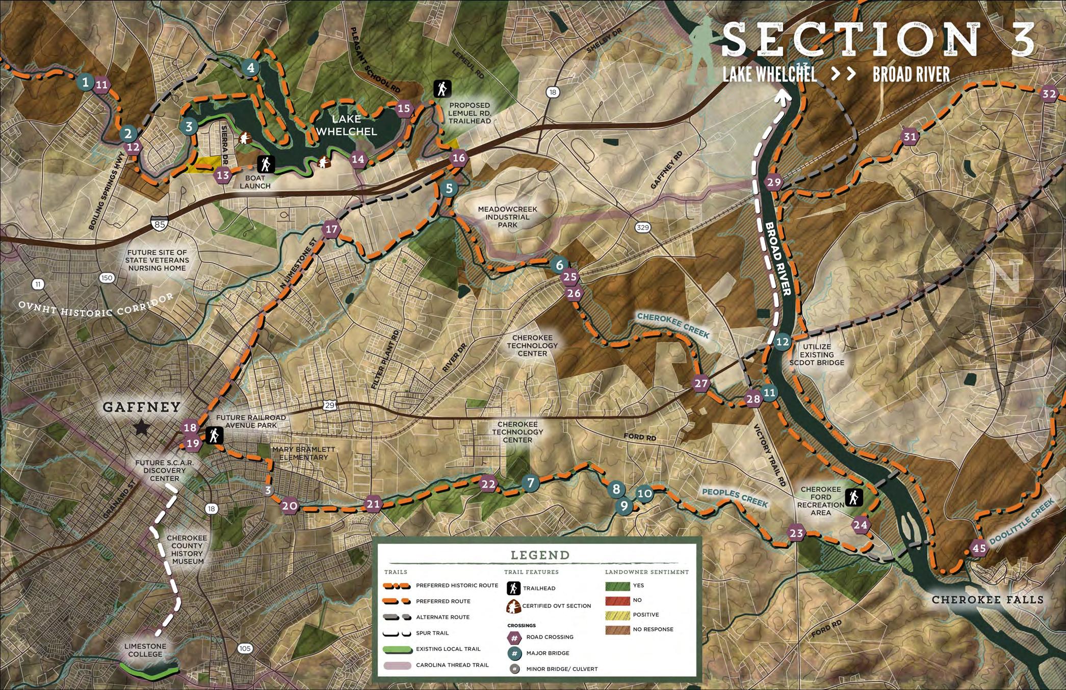 The Cherokee County OVNHT Committee, Carolina Thread Trail, and each local government entity must work in tandem to successfully realize the complete OVNHT. Trail implementation does not have to occur in a specific, linear order according to each planning section. In fact, the priority areas for implementation are merely suggestions and are in no way intended to limit creativity or work in "lower" priority areas. Trail implementation is an art and requires the acumen to recognize and seize opportunities, whether related to funding, landowner willingness, or politics.