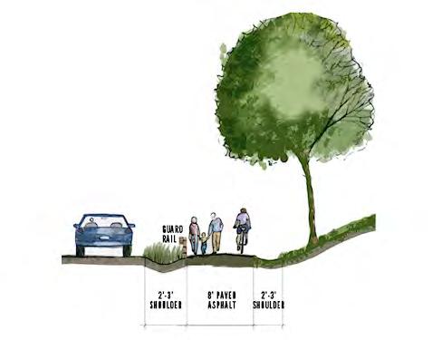 The northern preferred alignments deviate from the historic corridor in order to utilize large corporate landholdings and floodplain areas to connect to downtown Blacksburg. The preferred route along the south side of Canoe Creek extends east as a typical greenway for 3.5 miles. A spur trail connects users to the Lime Street Park trailhead. This route enters Blacksburg along Railroad Avenue. The trail then utilizes a portion of the Church Street right-of-way that can be converted to a multiuse urban path extending through downtown Blacksburg to Mountain Street.