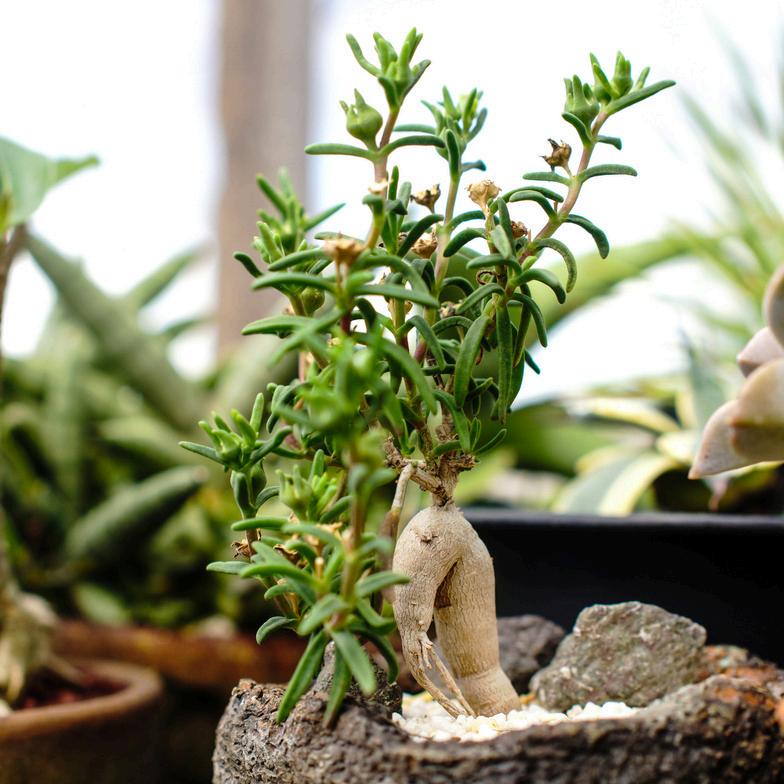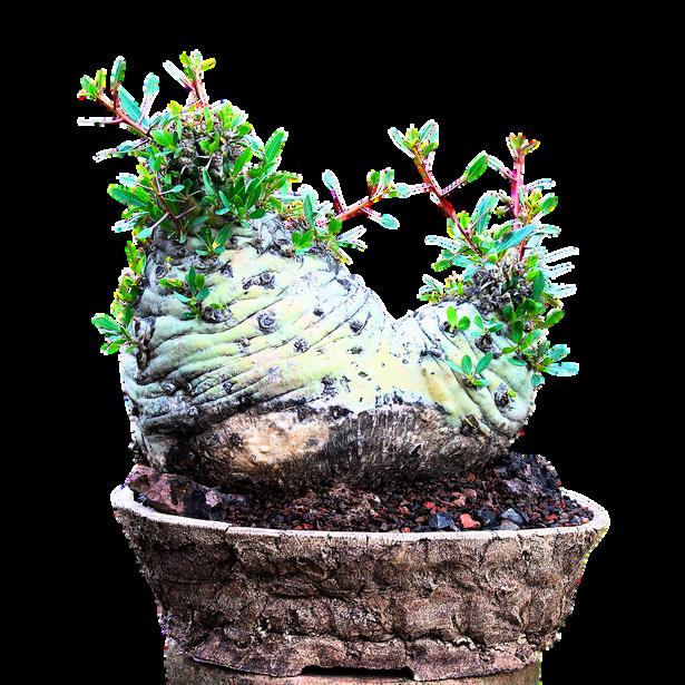 Thisplantishighlyvaluedforits swollentrunkandpetitesize.Itis idealforpotcultivation,thanksto itsuniquecaudex.Additionally,a strikingcharacteristicofthisplant isitswhiteflowers.Providesome afternoonshadeinthesummer.