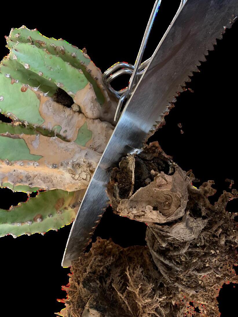 Tocareforadecayingplant,trim awaydeadtissueuntilreaching healthy,greenareas.Treat woundswithableach-water mixtureorapplyhorticultural sulfur,allowingittoforma protectivecallus.Forrottingroots, cutawaydamagedrootsandlet themairdry.Iftheentireroot systemdecays,removetheroots (shownhere),drythestemand placeitinpumiceuntilnewroots form.