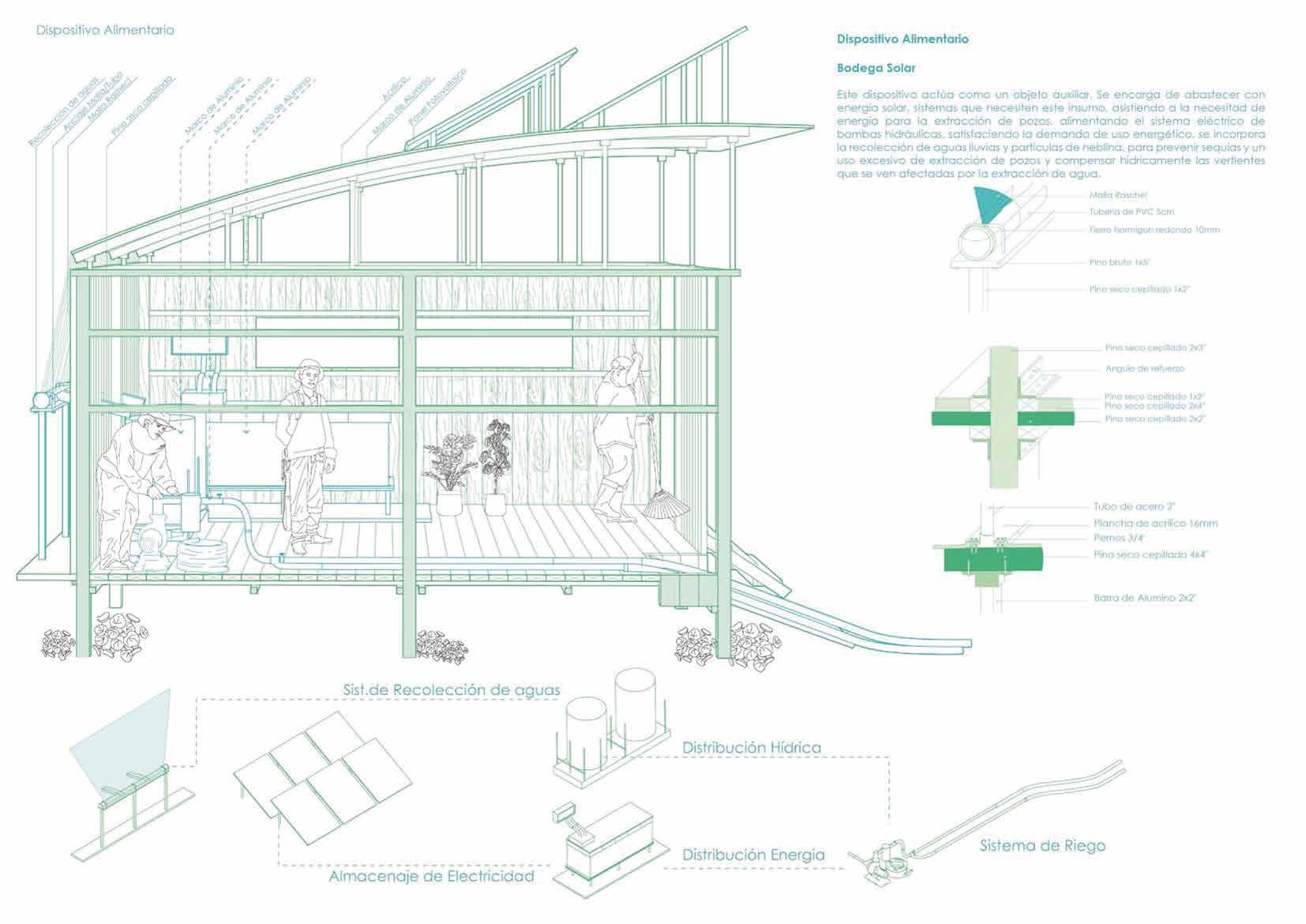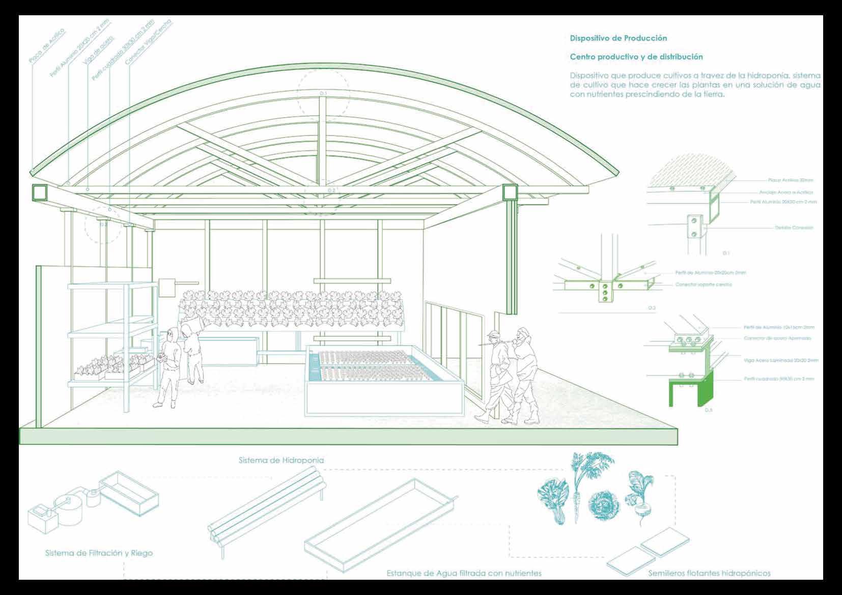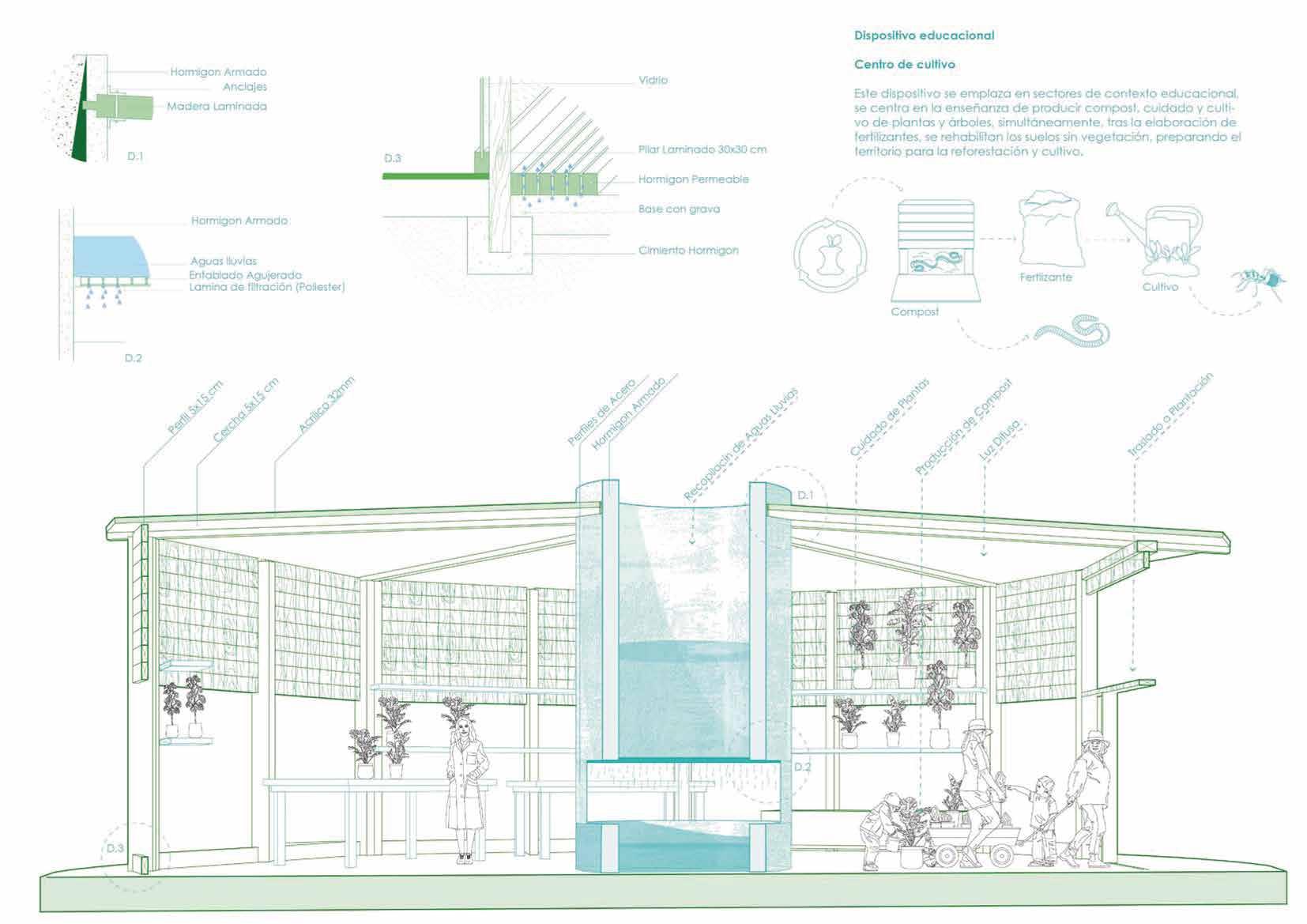 Proyecto: Se aborda el crecimiento de monocultivos en el valle del aconcagua, a pesar de la escases hídrica y degradación de suelo en la zona y en producción de viñedos, por el estres y abuso de absorción de nutrientes en el suelo y uso de agro-tóxicos en cultivos, contaminando e interviniendo acuiferos subterraneos y cortando el sistema natural del agua y ecosistema de el sector El Manzanar.