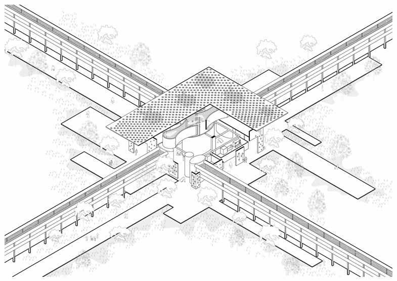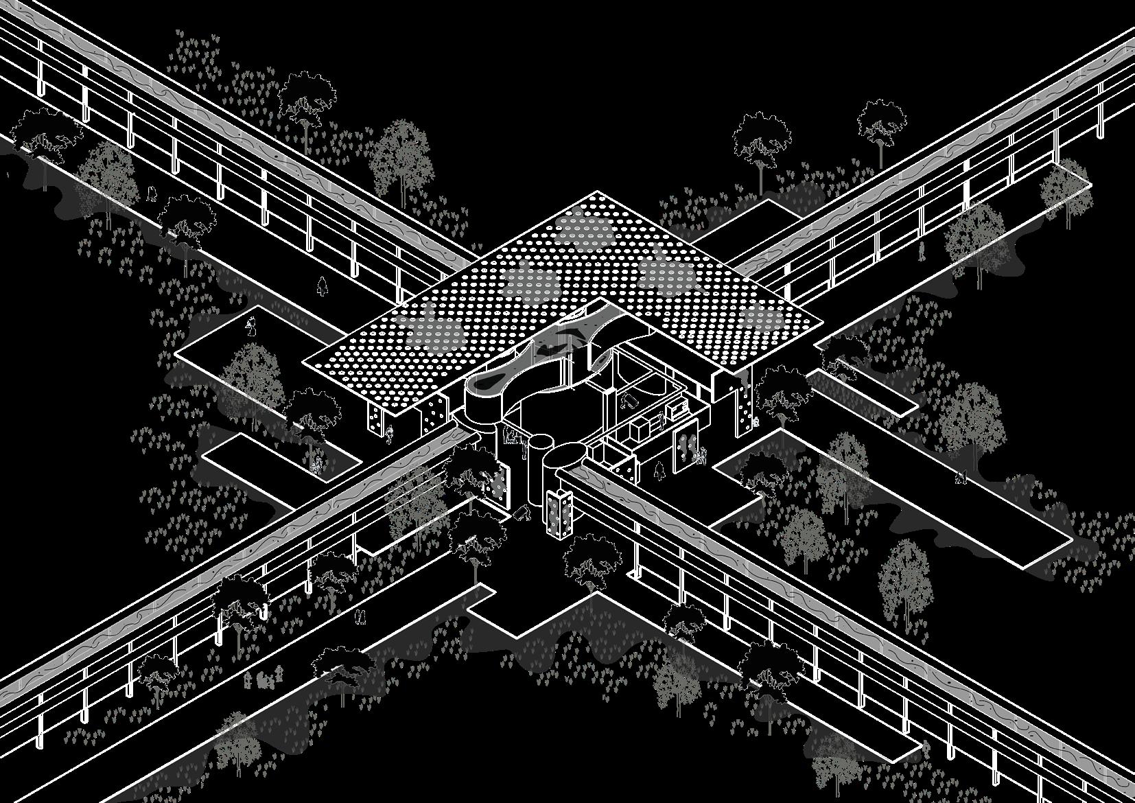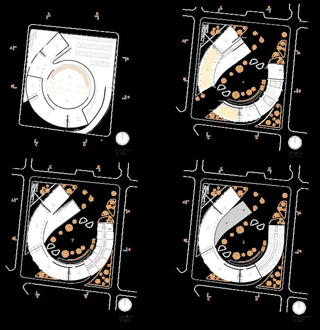 La forma de edificio responde a esto, de manera organica, extraida de cuatro cilindros anexados a un nucleo ortogonal que conecta y estructura las diferentes plantas y sus programas. Se trazan cuatro ejes guiados por el núcleo, lo que nos lleva al uso de un sistema estrcutural en base a marcos, los cuales digraman la propuesta programatica.