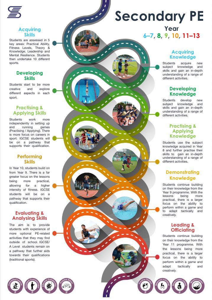 Students are encouraged to develop the DBIS Learner Profile Attributes throughout all areas of PE study. During the Health-Related Fitness module, they learn how to be a Balanced Individual by developing a healthy, active lifestyle in order to maintain and promote wellbeing. In the Sports Education module, students are given the opportunity to develop their Mindful Leadership qualities by planning and leading activities in small groups. During the Invasion and Net Games units, students learn to be Effective Collaborators and Confident Communicators, working in pairs or small-sided teams. They develop as Problem Solvers and Creative Thinkers as they develop tactics and strategies. Students are encouraged to show that they are Committed Learners by taking part in extracurricular activities in order to further develop their skills, knowledge and understanding in PE and sport.