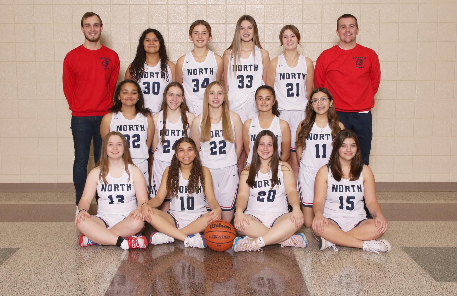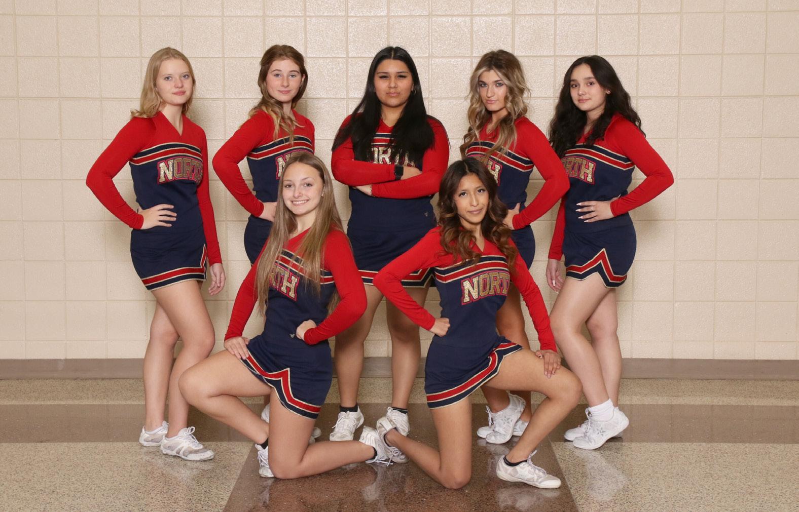 2022/23 WINTER SPORTS GUIDE BELVIDERE NORTH HIGH SCHOOL TOP ROW (L-R) LAUREN POOLE JOCELYN MYERS GUADALUPE RAMOS GABRIELLA FUSCO AURORA NAVA NEXT ROW DOWN (L-R) TANNA BRODY JOSELYN JIMENEZ CUELLAR JV SIDELINE CHEERLEADING