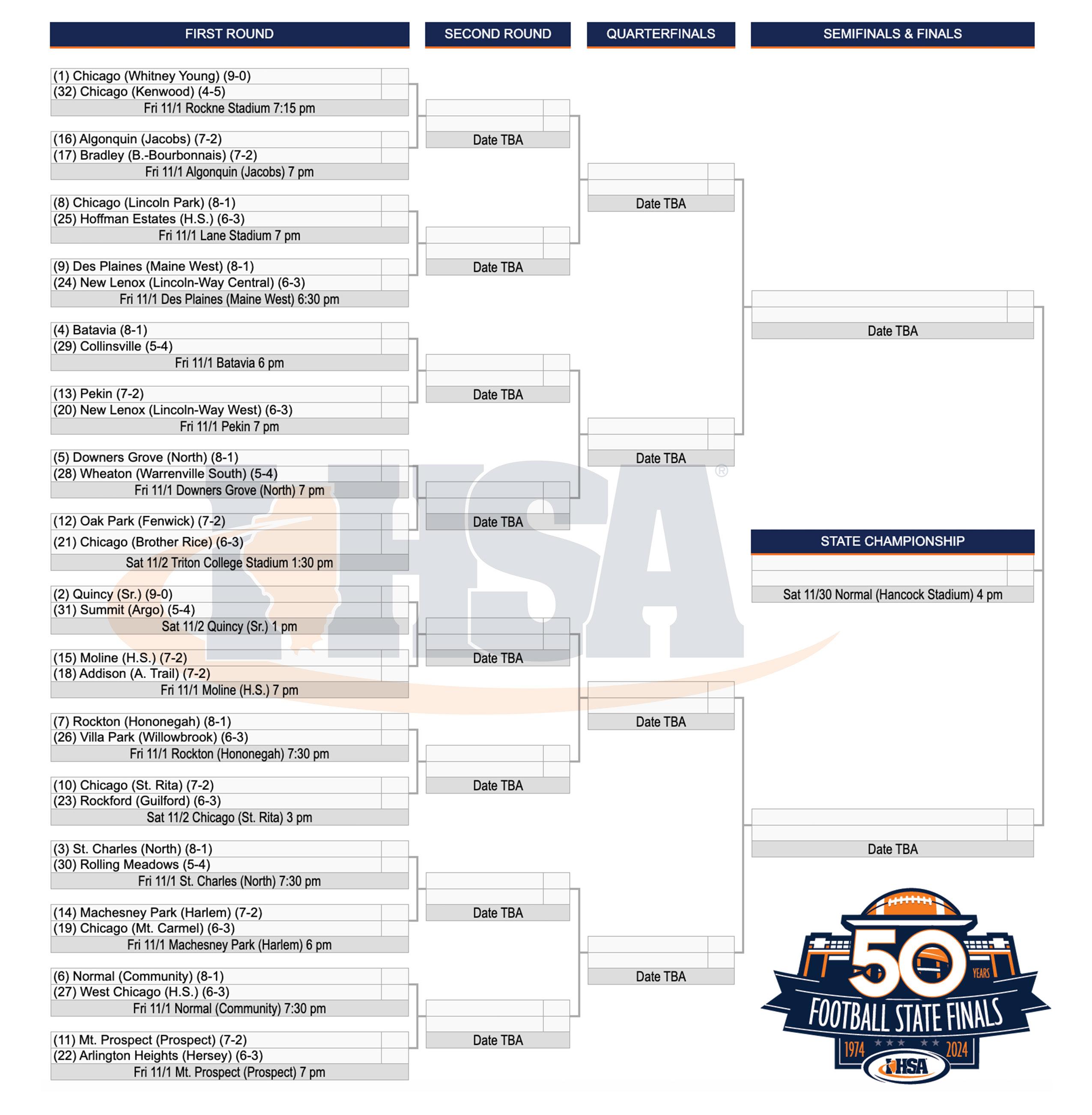 GAME 14 — #19 CHICAGO (MT. CARMEL) (6-3) AT #14 MACHESNEY PARK (HARLEM) (7-2), FRI., NOV. 1, 6:00 PM