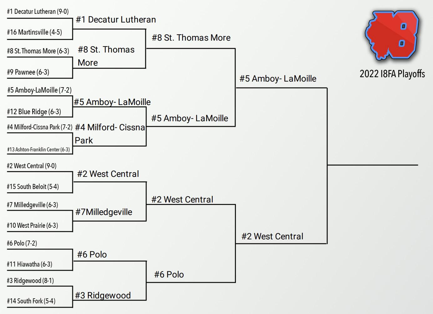 8 MAN RULES DIFFERENCES For the most part, the 8-Man game follows the same rules as 11-Man football. Here are the few exceptions: 1. You play with 2 less lineman and 1 less skill player 2. Only 5 men are required to be on the line of scrimmage to start an offensive play 3. All jersey numbers are eligible and can play any position. That’s right! Your QB may be #57 and your center may go out for a pass if he is the last man on the line of scrimmage 4. You must have 4 players on the front line of a kickoff return 5. You may have no more than 4 players to one side of the kicker on a kickoff 6. While the field is still the same length, it is just 40 yards wide. 2022 PLAYOFF BRACKET 2018: Milford (Milford- Cissna Park co-op) 66 - Alden Hebron 14 2019: Polo 50 - Milford (Milford- Cissna Park co-op) 26 2020: NO post season COVID- regular season played Spring 2021 2021: Polo 12 Orangeville 7 PREVIOUS STATE CHAMPIONSHIP SCORES