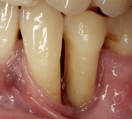 gevolge van een bacteriële infectie. De patiënt maakt een acute fase van necrotiserende parodontitis door. In eerste instantie is een antibioticakuur voorgeschreven bestaande uit metronidazol gedurende een week, te gebruiken in combinatie met spoelmiddelen waaronder chloorhexidine en waterstofperoxide. Bij de evaluatie na één week blijken de pijnklachten van de patiënt te zijn verminderd. De betrokken tanden en kiezen zijn nog wel gevoelig, maar de mate waarin is verbeterd. Er is een kalmerend effect waarneembaar in het beeld van het tandvlees. Het is minder rood en oogt rustiger, hoewel er geen verandering is in de afmeting van de botsequester. De patiënt zal doorgaan met spoelen voor de duur van een maand om te kijken of in die periode het botsequester spontaan loskomt. Na één maand is er sprake van een lichte verbetering. Het betrokken gebied is nog steeds gevoelig. Aangezien het botsequester niet uit zichzelf loskwam, is er gekozen voor chirurgische verwijdering waarbij het sequester werd losgeboord en het tussen de twee elementen vandaan kon worden gehaald. Er ontstond daarmee een zeer grote tussen ruimte die met een grote rager gereinigd kan worden. Na vier jaar zijn beide elementen nog steeds aanwezig maar de situate vereist regelmatige nazorg bij de mondhygienist.