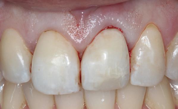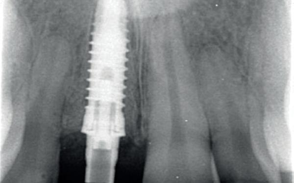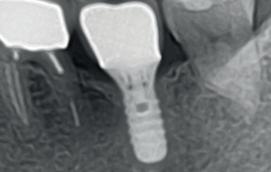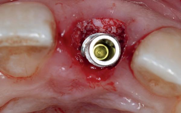 1. Ik verwijder het element met granoloom en laat het 3 maanden genezen. Na 3 maanden plaats ik het implantaat en weer 3 maanden later de superstructuur. Ik gebruik dan vaak geen botsubstituut en plaats het implantaat in het genezen bot. Of: