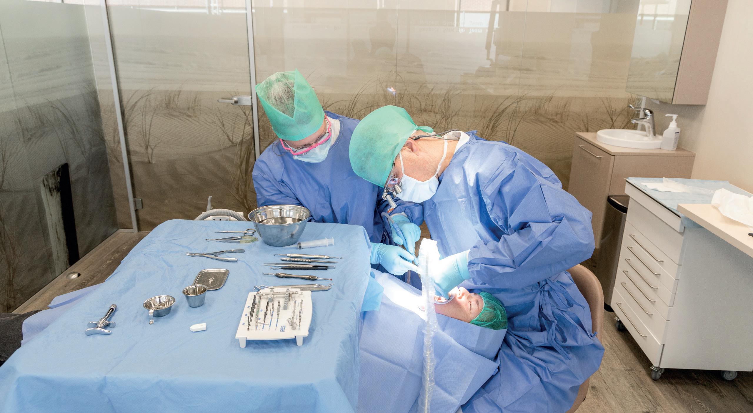 element te verwijderen. Maar dat is in mijn verwijspraktijk nog geen 10 procent van de indicaties. Dat wil zeggen dat het merendeel komt met een geïnfecteerde kaakwal rondom radices. In het kader van een langetermijnsoplossing krijgt de patiënt een keuze.