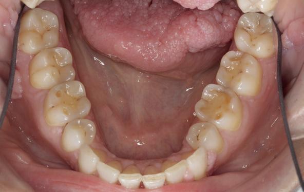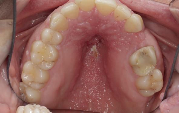 2004 (afbeelding 1a) waren er nog enkele verdiepte pockets aanwezig, maar dankzij goede zelfzorg en regelmatige 3-maandelijkse nazorg is het resultaat in 2024 stabiel gebleken (afbeelding 2a). De klinische foto’s van 2004 en 2024 laten zien dat de patiënte inmiddels zoveel vertrouwen in haar gebit heeft gekregen dat ze heeft besloten om orthodontische behandeling te ondergaan om de tandstand te optimaliseren (afbeelding 2b).