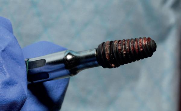 1. Explantatie van het implantaat. Het implantaat werd voorzichtig verwijderd, waarbij ik probeerde zoveel mogelijk bot te behouden.