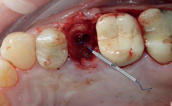 2. Curettage en reiniging. De alveole werd intensief gecuretteerd en gespoeld tot er geen exsudaat meer aanwezig was. Met goede communicatie kon ik de patiënt overtuigen om 3 maanden later terug te komen voor de botopbouw, zodat we het beste fundament konden creëren voor een duurzame oplossing.