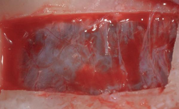 3. Botopbouw met GBR. Ik koos voor een combinatie van allograft, xenograft en autograft om de botdeficiëntie aan te pakken. Dit mixen van bottypes creëerde een optimale omgeving voor regeneratie.