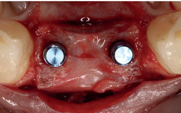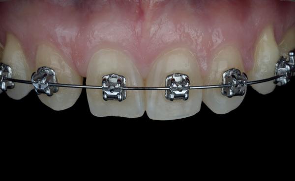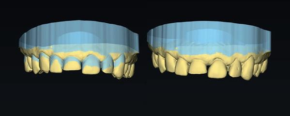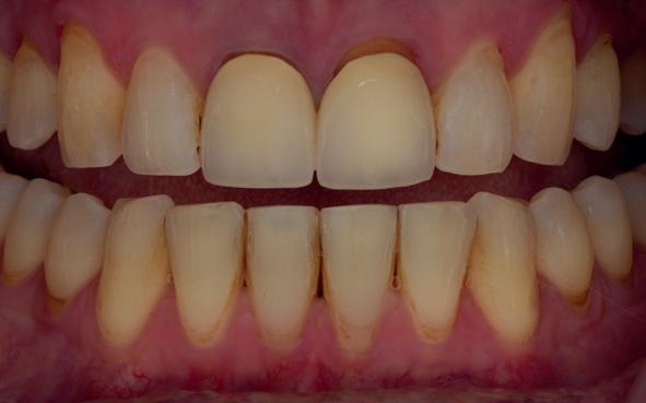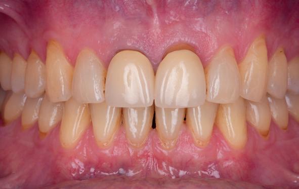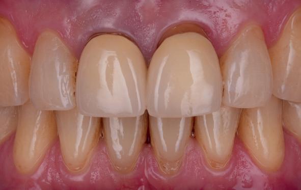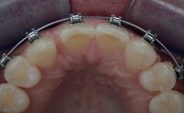 Op 16-jarige leeftijd werd de patiënt door haar behandelend orthodontist naar de auteur verwezen voor een restauratieve oplossing voor de afwezige 11 en 21. In de tussenliggende periode had patiënt een retainer gedragen met twee kunststof tanden (afbeelding 1). Zowel de patiënt als haar moeder hadden een sterke voorkeur voor een implantaat gedragen vaste oplossing. Gezien haar jonge leeftijd was dit echter nog geen optie, omdat er nog verticale groei te verwachten viel. Implanteren op jonge leeftijd – dat wil zeggen vóór het 21e levensjaar – kan resulteren in een infrapositie van het implantaat, omdat de rest van het gebit nog verticaal kan doorgroeien.