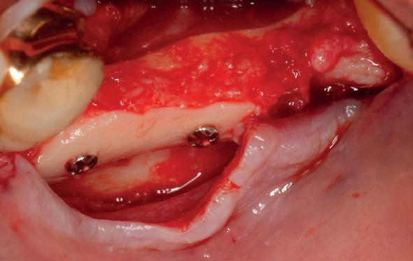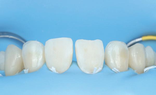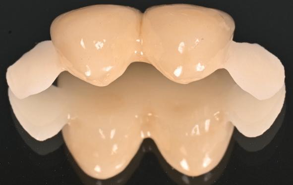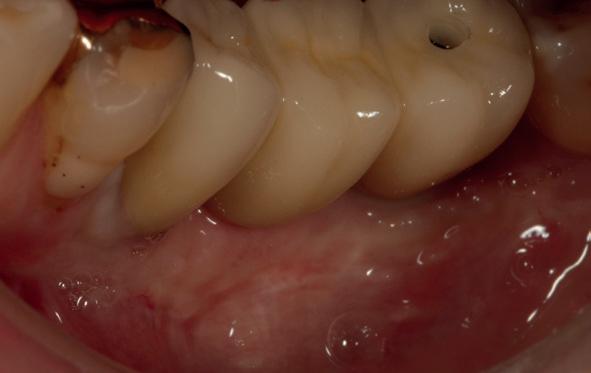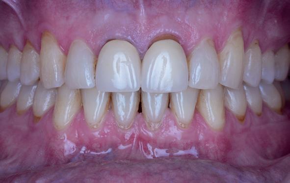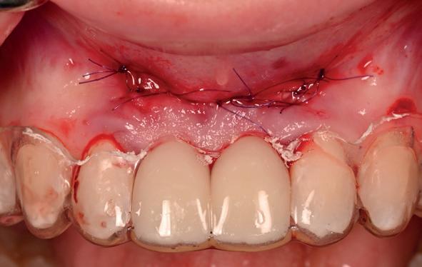tinaal geslepen te worden als er geen 1,5 mm ruimte voor de vleugels behaald kan worden. De ruimte was op de dunste plekken 1 mm, dus een kleine preparatie in de 12 en 22 palatinaal was nodig. Omdat de kaak volledig afgevlakt was en dun was geworden, kunnen de dummies van de etsbrug enkel op de kaak “gelegd worden”, maar daarbij zijn er geen papillen en staat de cervicale rand van de dummies net voor de kaak. Een esthetisch resultaat kan daarmee niet behaald worden. Daarom is een aanvulling van de zachte weefsels in de breedte nodig, als het creëren van een emergence profile, waarbij het oogst alsof de gebitselementen uit het weefsel vertrekken.