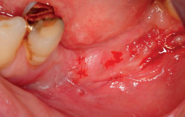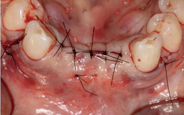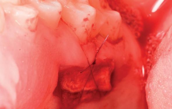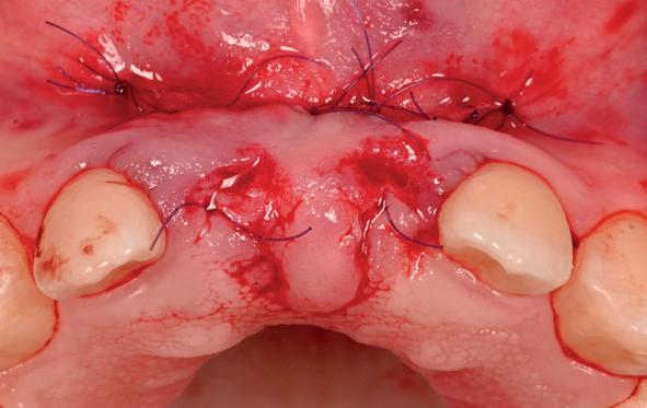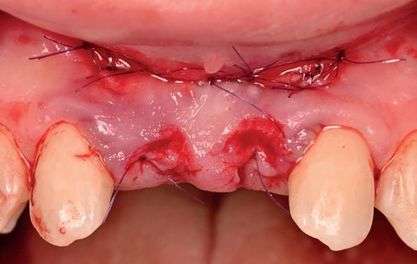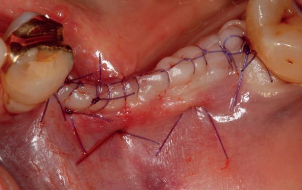 pincisies met hechtingen naar het buccale en coronale deel getrokken en aldaar ingehecht. Met twee incisies werd ook de emergence profile gecreëerd (afbeelding 6-13). Voor een goede genezing van het