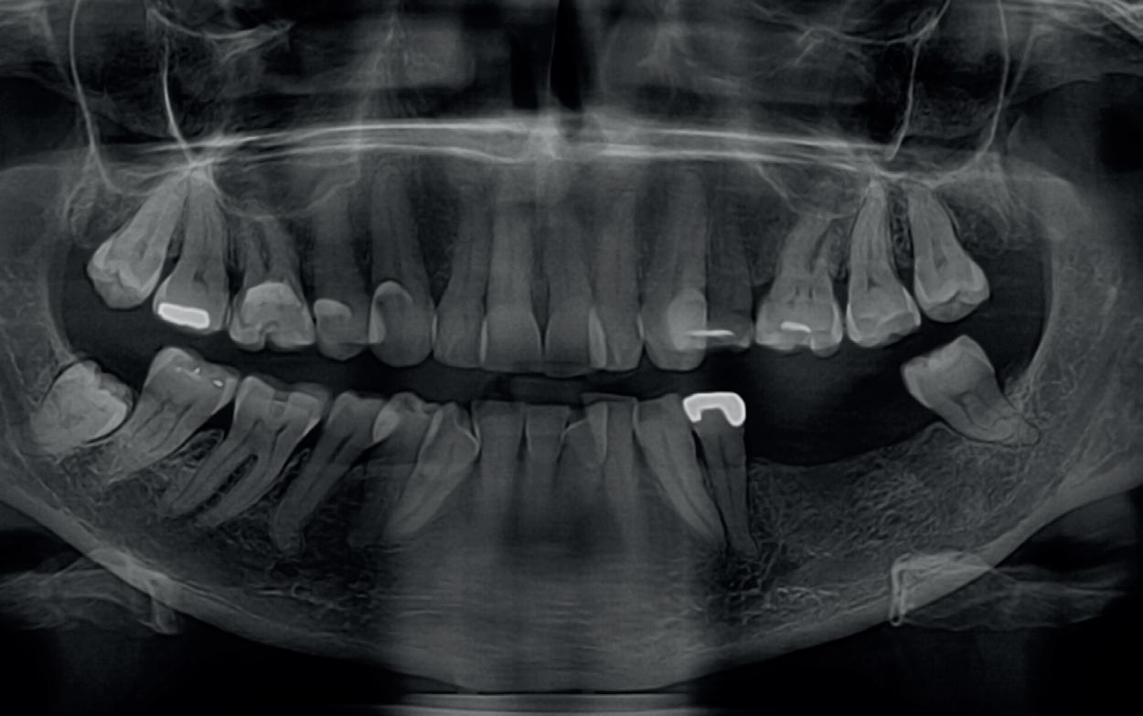 Een gezonde, jonge dame had op 8-jarige leeftijd een trauma op school waarbij ze op haar voortanden was gevallen. Volgens haar moeder waren deze voortanden tot onder het tandvlees afgebroken. Nadat ze