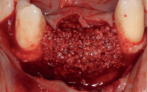 Voor de aanvulling zachte weefsels chirurgie werd gekozen voor de VISTA techniek, hierbij worden er twee incisies partial thickness flap hoog in de mucosa gemaakt, waarna er ruimte vanuit de incisies wordt getunneld tussen de gingiva en het periost door middel van VISTA tunnel instrumenten. Uit het palatum links werd een vrij gingivatransplantaat geoogst van 15x10 mm met een dikte van 3 mm, die voor inhechten werd geëpithelialiseerd. Als het epitheel niet wordt verwijderd, kan deze graft door
