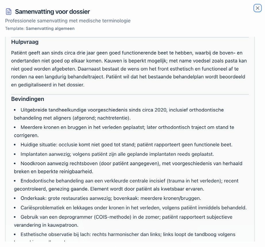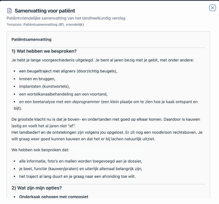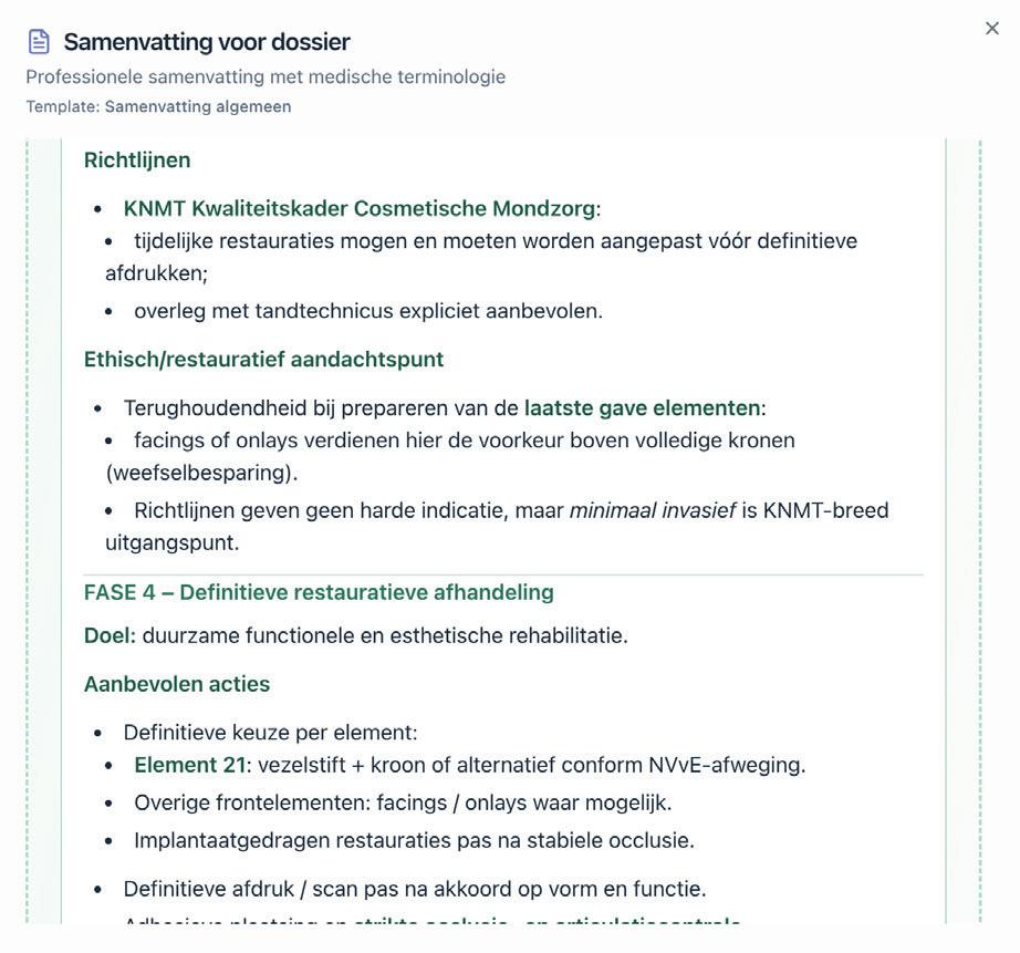 De AI zet het consult om naar een vaste structuur (anamnese, bevindingen, behandelplan etc.). Daarnaast kan je de AI vragen voor advies en toetsing van je behandelplan aan de bestaande richtlijnen.