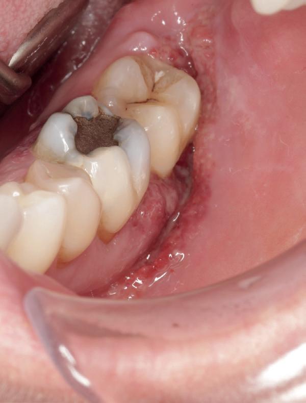 Tijdens routinecontroles kunnen tandartsen letten op symptomen die wijzen op mondademhaling, zoals een droge mond (afbeelding 8), terugtrekkend tandvlees en slijtage van het tandglazuur door bruxisme. Orthodontische afwijkingen zoals een smal gehemelte en malocclusies kunnen ook indicaties zijn van een chronische mondademhaling. Daarnaast is het checken van het tongriempje op jonge leeftijd cruciaal zodat borstvoeding mogelijk is en de tong tegen het gehemelte kan rusten. Een multidimensionale anamnese, die rekening houdt met fysieke, biomechanische, psychologische en sociale factoren, is essentieel om een compleet beeld te krijgen van het ademhalingspatroon van de patiënt.