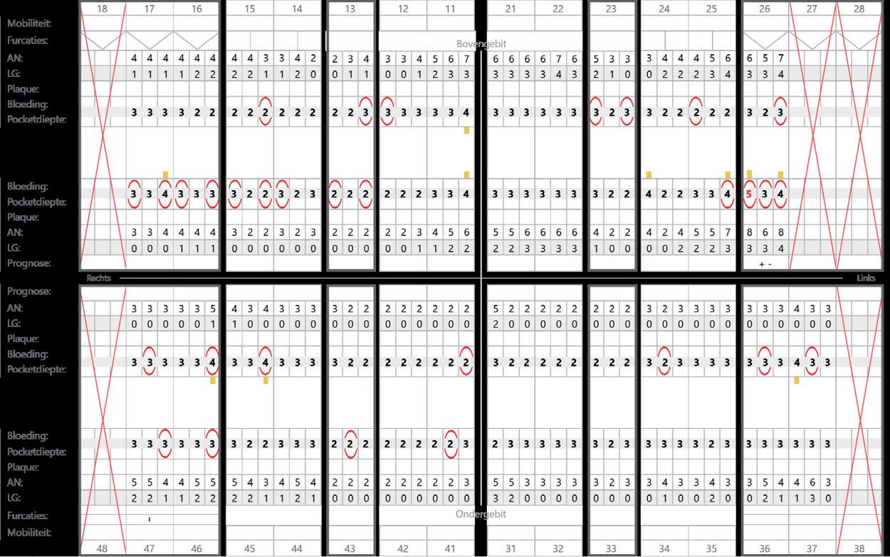 Een tijd geleden vroeg een goede vriend van ons op een verjaardag of ik een keer tijd had om naar zijn gebit te kijken. Natuurlijk maakte ik daar tijd voor. We spraken af en op de de betreffende dag kwam hij toch ietwat zenuwachtig binnen. Ik vroeg hem of hij er tegenop zag, maar hij zei van niet. Hij vertelde dat hij een maandje geleden in zijn moederland zijn gebit had laten reinigen, dus het zou allemaal wel meevallen. Na de anamnese nam hij plaats in de stoel. Ik keek in zijn mond en zag dat er behoorlijk wat supragingivaal tandsteen aanwezig was. Ik besloot te beginnen met een pocket registratie. Tijdens de registratie legde ik hem uit wat ik precies aan het doen was en waarom ik dit deed. Bij de molaren zakte ik direct al tot 10 mm de diepte in. Veel subgingivaal tandsteen. Ik vroeg of ze hem vorige maand uitleg gegeven hadden over parodontitis, maar eigenlijk wist ik het antwoord al. We besloten het zoals gebruikelijk goed aan te pakken en een pardontiumstatus te maken en hierna gaf ik hem voorlichting over parodontitis. De verstandskiezen hadden de diepste pockets, maar omdat ik geen röntgenfoto’s had, was er slechts een vermoeden over de prognose