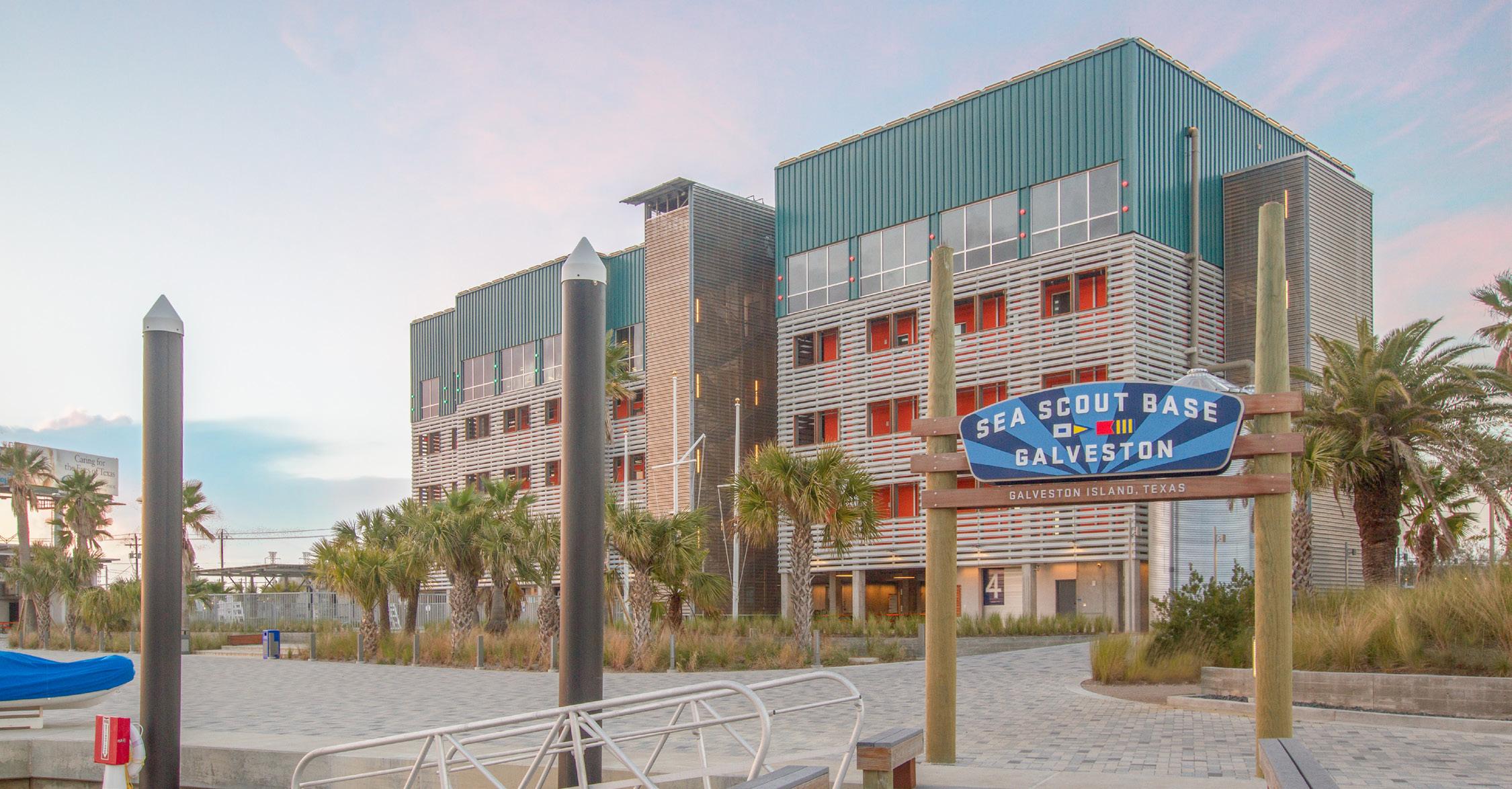 DBR worked with Resource Planning Architects to provide mechanical, electrical, and plumbing engineering services for this new five-story, 57,000 sf base in Galveston, Texas. DBR completed two phases; the marina site multipurpose pavilion, and the dormitory with meeting areas and a kitchen on the fifth level. This facility serves as a meeting space for the Boy Scouts of America and the Sea Scout Academy program, which focuses on nautical education and aquatic activities. The space includes a pool, foot paths, gardens, and a 50-slip marina. This project achieved LEED Platinum certification in 2018.