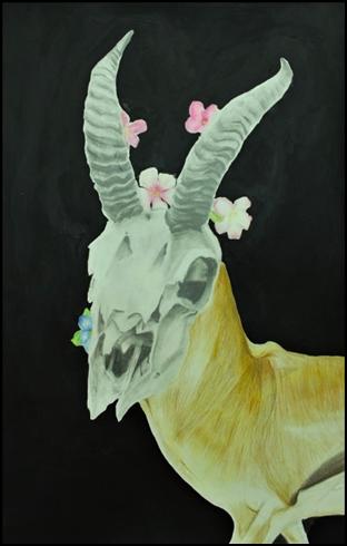Left: “This mixed media artwork blends the world of the living with the relics it leaves behind. Graphite has been used for the detailed shading on this gazelle skull, juxtaposed with the animal’s natural hide and flowers to represent beauty.” - Sama Hasan Al-Amin