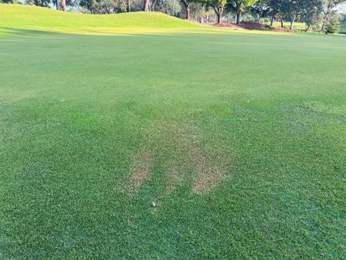 However, please be sure to apply these products while you are on the cart path and not standing on any grass. DEET will burn turf as fast as any herbicide and can take days or weeks to recover depending on where it was sprayed. As an example the picture below is off from #13 collar last season and #11 green is still recovering bug spray damage from last weekend.
