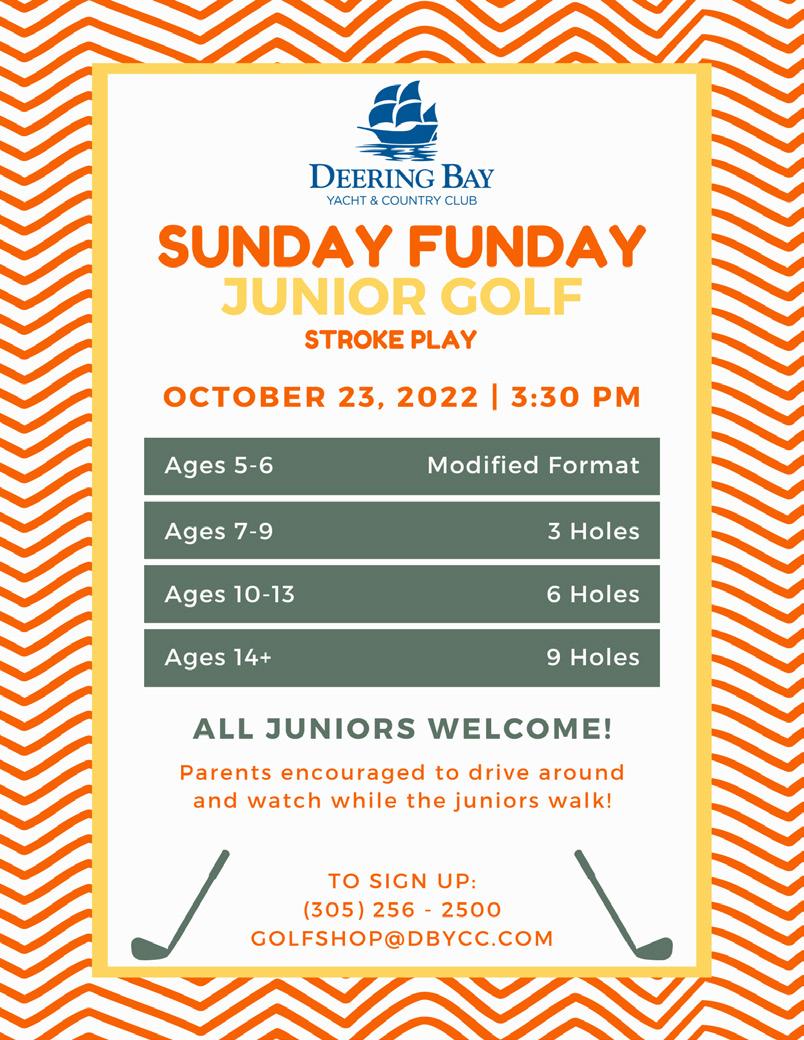 Sunday, October 23rd is our Sunday Funday Junior Golf event. We had to reschedule the original date on October 2nd due to rain outs impacting the junior golf class schedule. Sign ups for this event are in the Golf Shop.