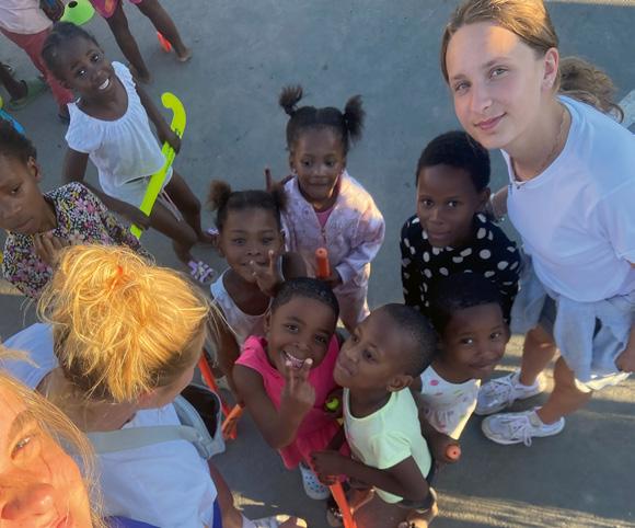 Mailina Petrich oben rechts im weißen Pullover zusammen mit den Hockeykindern und anderen Volos
