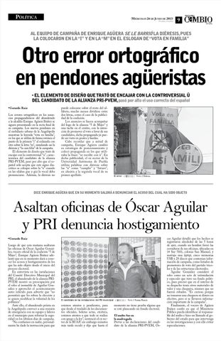 otro error ortográfico en pendones agüeristas • el elemento de diseño que trAtó de encAjAr con lA controversiAl ü del cAndidAto de lA AliAnzA pri-pvem, pasó por alto el uso correcto del español •Gerardo Ruiz Los errores ortográficos en los anuncios propagandísticos del abanderado a la alcaldía Enrique Agüera Ibáñez se siguen presentando en la recta final de su campaña. Los nuevos pendones en el mobiliario urbano de la Angelópolis muestran la leyenda “vota en familia”, en los que se utiliza de forma errónea el punto de la primera “i” al enlazarla con otro sobre la letra “m”, simulando así la diéresis y “la cara feliz” de la campaña. El elemento de diseño que trató de encajar con la controversial “ü”, característica del candidato de la alianza PRI-PVEM, pasó por alto que el español sólo acepta que este signo diacrítico se coloque sobre la “u” cuando en las sílabas gue y gui la vocal deba pronunciarse. Además, la diéresis no