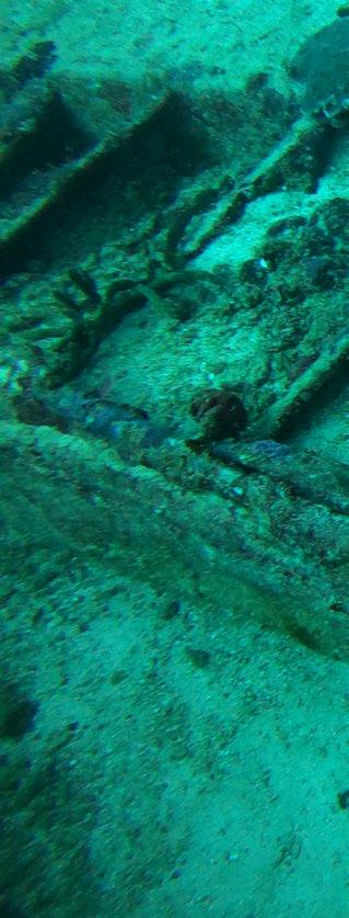 Descendimos con prontitud los casi 40 metros de profundidad hasta llegar a el fondo de arena, Rodrigo usando su brújula nos indico la dirección, pasaron 2 minutos antes de poder ver cual figura fantasmagórica los pedazos de lo que fuera un gran barco, los huracanes y el tiempo de habían partido en pedazos. Todavía pudimos observar un ancla con su cadena, una claraboya u ojo de buey, la escalera, su motor y su enorme propela.