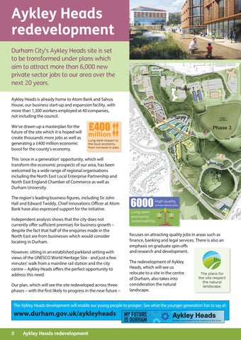 focuses on attracting quality jobs in areas such as finance, banking and legal services. There is also an emphasis on graduate spin-offs and research and development. The redevelopment of Aykley Heads, which will see us relocate to a site in the centre of Durham, also takes into consideration the natural landscape.
