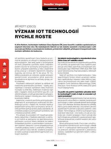 VÝZNAM IOT TECHNOLOGIÍ RYCHLE ROSTE S Jiřím Rottem, technickým ředitelem Cisco Systems ČR, jsme hovořili o nabídce společnosti pro segment internetu věcí. Na následujících řádcích se tak můžete seznámit s hardwarovým i softwarovým portfoliem a souvisejícími službami, primárními odbytišti, přístupem k bezpečnosti nebo možným výhledem do budoucna.