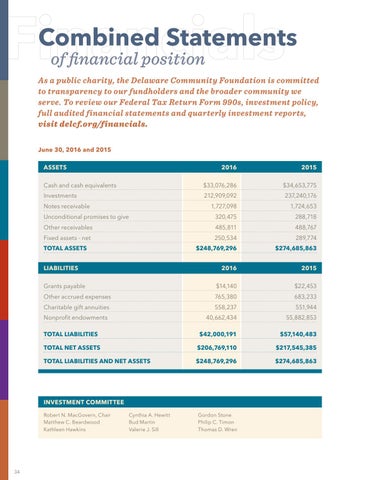 As a public charity, the Delaware Community Foundation is committed to transparency to our fundholders and the broader community we serve. To review our Federal Tax Return Form 990s, investment policy, full audited financial statements and quarterly investment reports, visit delcf.org/financials. June 30, 2016 and 2015 Assets
