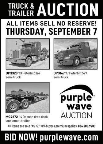 Page 12 Get financed now! Apply here: dch.com/tc | 888-829-9763 www.truckerschoice.com Vol. 34, No. 16 Volvo D13M425 12.8 L Diesel 425 hp Engine, 11097 Engine hrs, 545,567 miles Ritchie Bros. Auctioneers (800) 663-8457. Bolton, ON Text P0B6M to 27414 11 2012 Freightliner Cascadia Purple Wave Auction (866) 608-9283. Manhattan, KS Text 0H05 to 27414 77 2018 Freightliner CASCADIA 125 $54,900 Sioux Falls Truck & Trailer (844) 311-5259. Sioux Falls, SD Text 1LUF to 27414 8 2012 Freightliner M2 106 6 Cylinder 8.3 L Diesel 330 hp Engine, 191 in. Wheelbase 281,421 miles Ritchie Bros. Auctioneers (800) 663-8457. Humble, TX Text P1A2V to 27414 8 2013 Detroit DD13 6 Cylinder 12.8 L Diesel 500 hp Engine, 216 in. Wheelbase Ritchie Bros. Auctioneers (800) 663-8457. Bolton, ON Text P0B7H to 27414 16 2017 Cummins ISX15 6 Cylinder 15 L Ultra Low Sulfur Diesel 450 hp Engine, 53,200.0 lb. GVWR, 481,353 miles Ritchie Bros Auctioneers (800) 663-8457. Newnan, GA Text P0B04 to 27414 8 2018 Paccar MX-13 6 Cylinder 12.9 L Ultra Low Sulfur Diesel 455 hp Engine, 68 in. Mid Roof Sleeper Cab 495,272 miles Ritchie Bros. Auctioneers (800) 663-8457. North East, MD Text P1A1J to 27414 10 2016 Volvo VNL670 557,837 miles Ritchie Bros. Auctioneers (800) 663-8457. Humble, TX Text P1AH9 to 27414 8 2019 Volvo VNL760 Volvo D13M 6 Cylinder 12.8 L Ultra Low Sulfur Diesel 425 hp Engine, 621,952 miles Ritchie Bros. Auctioneers (800) 663-8457. North East, MD Text 6WW3T to 27414 16 2019 Western Star 5700 Detroit 15 Liter, AUTOMATIC 12 Speed, Double Bunk, Good Rubber, 230” WB 475,417 miles 505 HP $74,500 Sweet Equipment Sales, LLC (616) 261-8790. Byron Center, MI Text 4BNQ to 27414 21 2019 Western Star 5700 COMES WITH EXTENDED COVERAGE WARRANTY, Good Rubber, 230” WB 460,571 miles 475 HP $72,900 Sweet Equipment Sales, LLC (616) 261-8790. Byron Center, MI Text 3UAQ to 27414 16 2017 Volvo VNL300 Volvo D13J405 6 Cylinder 12.8 L Diesel 405 hp Engine 366,164 miles Ritchie Bros. Auctioneers (800) 663-8457. South Vienna, OH Text 6WW0Y to 27414 7 2016 Volvo VNL64T670 All New Drive Brakes, Truck is ready to work! 861,461 miles 475 HP $29,900 Sweet Equipment Sales, LLC (616) 261-8790. Byron Center, MI Text 0TWL to 27414 20 2020 Volvo VNL64T760 $69,900 Sioux Falls Truck & Trailer (844) 311-5259. Sioux Falls, SD Text 2YLF to 27414 12 2015 Volvo VNL670 533,277 miles Ritchie Bros. Auctioneers (800) 663-8457. North East, MD Text P1AH6 to 27414 8 Text