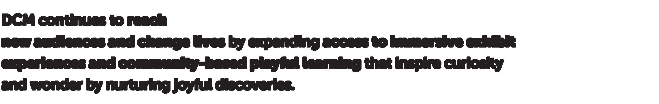 DCM continues to reach new audiences and change lives by expanding access to immersive exhibit experiences and community-based playful learning that inspire curiosity and wonder by nurturing joyful discoveries.