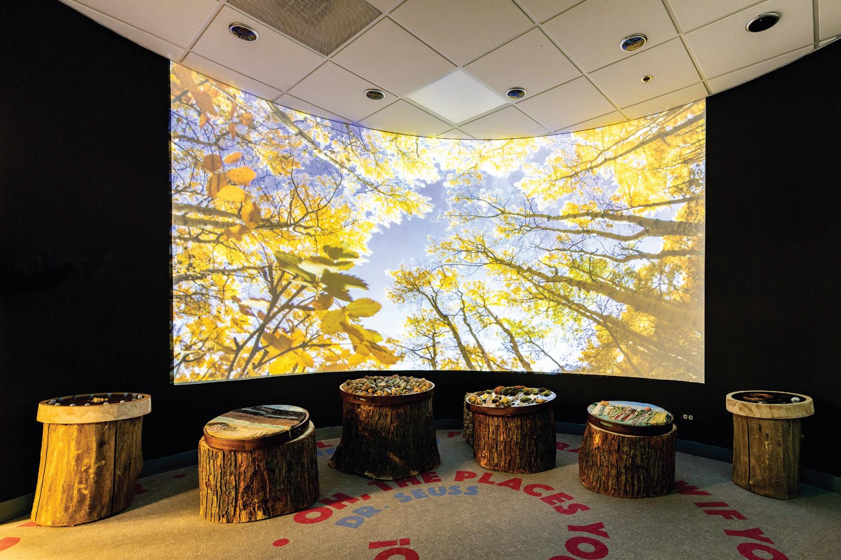 Supported by Dunkin' Joy in Childhood Foundation and City of Naperville Special Events and Community Arts Fund, o ers a truly immersive experience where guests are met with dimmed lighting, tranquil music, and interactive images of landscapes projected on the wall. Filled with natural wonder, this exhibit space hosts loose parts, a beautifully lit sound panel mural, a bookshelf full of nature-inspired reading, and big squishy seating to round out the room as a relaxing place for quiet contemplation.