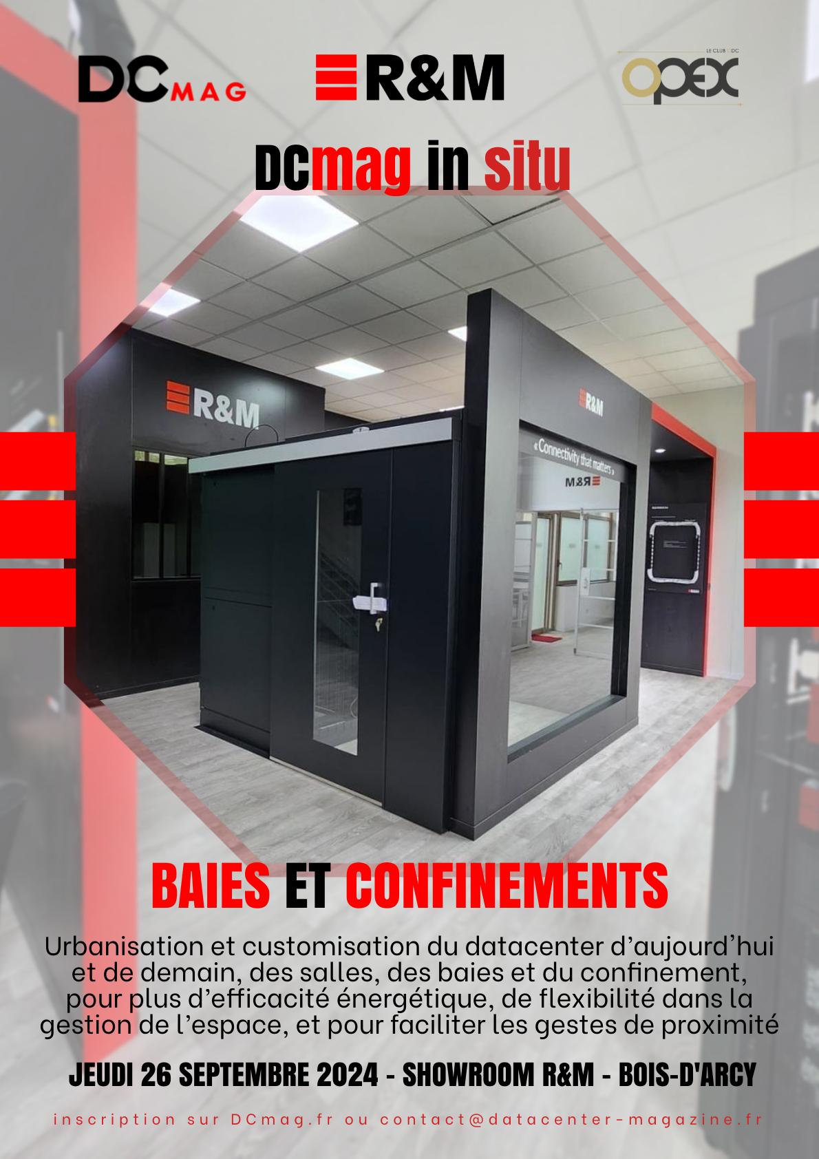 Le jeudi 26 septembre 2024 sʼest tenu notre événement DCmag In Situ “Baies et confinement”, dans le nouveau showroom de R&M et en partenariat avec le Club OPEX. Le dossier qui précède accompagne cette matinée dʼéchanges et de partages, avec les experts de R&M, et entre pairs exploitants de datacenters.