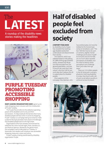 Half of disabled people feel excluded from society A REPORT PUBLISHED by disability charity Scope has revealed that workingage disabled adults feel undervalued and disconnected from society. The research, which was collated based on the polling of 2,000 working-age disabled adults, showed that 49 per cent feel excluded from the general population, and two in five (41 per cent) don’t feel valued. Less than half (42 per cent) also don’t believe the UK is a good place for disabled people. One supporter of the campaign, Max Stainton, who