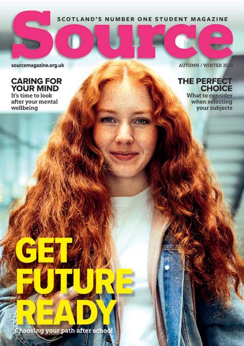 SCOTLAND’S NUMBER ONE STUDENT MAGAZINE AUTUMN / WINTER 2022sourcemagazine.org.uk CARING FOR YOUR MIND It’s time to look after your mental wellbeing THE PERFECT CHOICE What to consider when selecting your subjects Choosing your path after school GET FUTURE READY