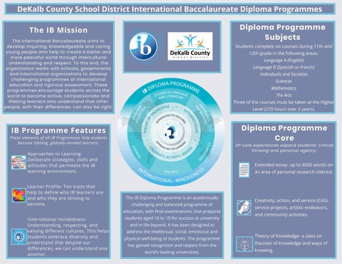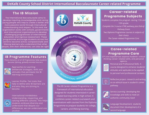 The IB Career-related Programme is a framework of international education designed for students interested in careerrelated learning while in high school. It combines career-related coursework and examinations with courses from the Diploma Programme to prepare students for college, careers, and lifelong learning.