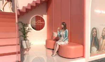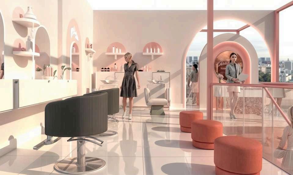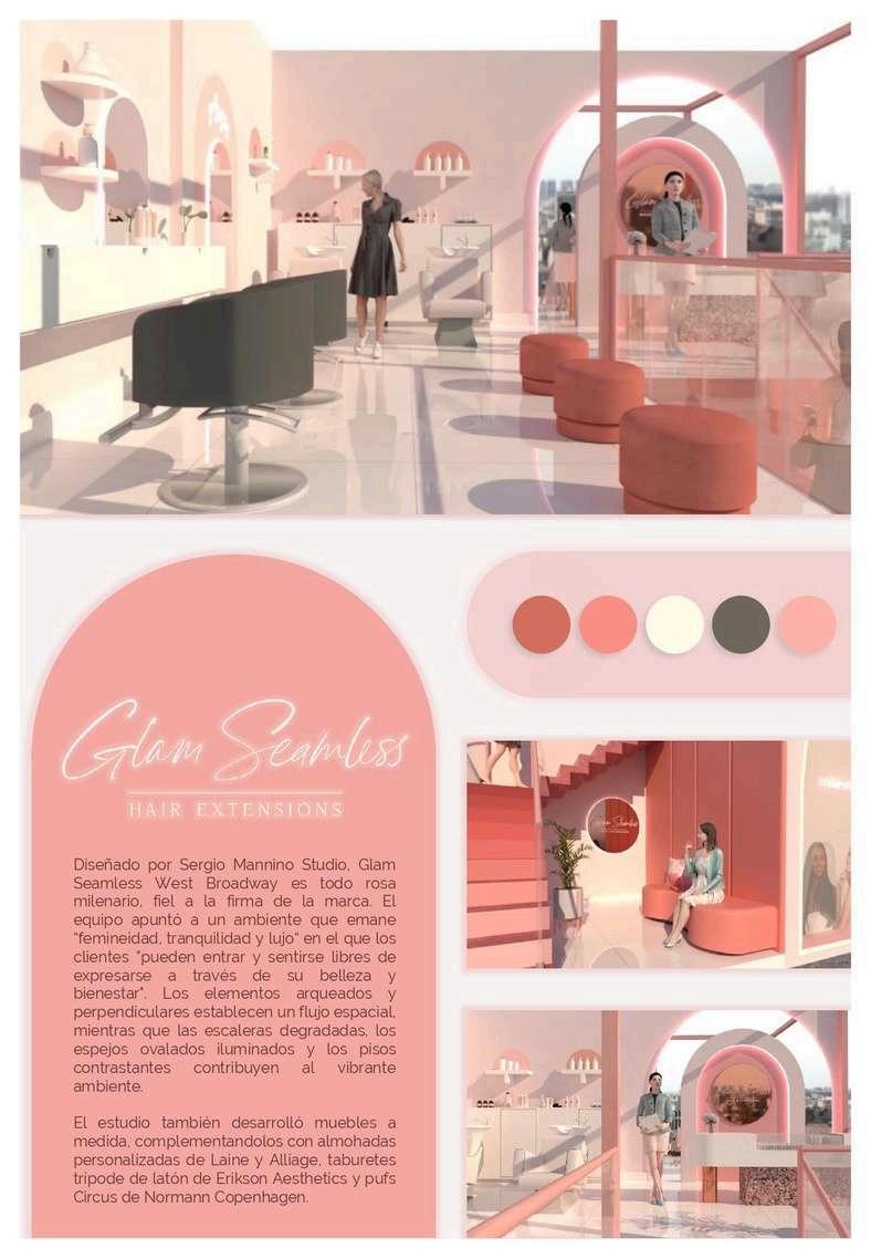 Diseñado en 2022 Glam Seamless West Broadway es todo rosa m lenario fiel a la f rma de la marca El equipo apuntó a un ambiente que emane “femineidad, tranquil dad y ujo“ en el que los clientes "pueden entrar y sentirse l bres de expresarse a través de su belleza y bienestar" Los elementos arqueados y perpend cu ares establecen un flujo espacial, mientras que as escaleras degradadas, los espe os ovalados lum nados y los p sos contrastantes contribuyen al v brante ambiente